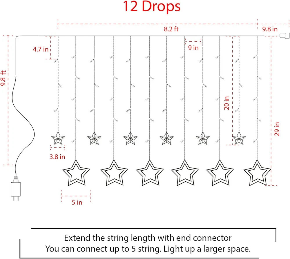 Store New Arrivals Add to Favorite View Feedback Contact Fast deliveries to the customer's home Quality customer service John Make the customers happy! Star Curtain Lights for Bedroom - Plug-In 9Ft 138 LED Fairy Twinkle Lights with 12 Star Drops, Connectable Window Lights with Remote 8 Lighting Modes for Indoor Xmas Ramadan Decoration, Warm White Description 【 Christmas Star Lights with 12 Star Drops 】- The star curtain lights are 9 feet long with 12 drops of cute star-shaped bulbs that make an adorable addition to your porch or outdoor living space. 138 LED bulbs make up the 12 drops ( 6 big stars of 5”and 6 small stars of 3.8”), each of which is roughly 9 inches wide. 【 8 Lighting Modes 】- There are 8 different modes for the star curtain string lights, including waves, sequential, slow glow, flashing, slow fade, twinkle, and combination, as well as standard on and off. It can be controlled by pressing the button on the adaptor and remote control. Ideal for your everyday decor as well as holiday decoration. 【 Remote and Timer 】- The star string lights come with a remote control, allowing you to easily turn the lights on and off, select from 8 flashing modes, adjust brightness and set a timer for 6 hours across the room with a 10-meter-long working range. Perfectly convenient if the string lights are set up in a hard-to-reach location 【 Connectable Up to 5 Sets 】- You can connect up to 5 sets of these star string lights end to end, which is incredibly convenient for decorating broad areas or a sizeable outdoor object - such as your window, rooftops or an oversized tree. Perfect for large-scale cascading lighting displays and festival decorations. 9.8-foot lead cord for easy connection. 【 Wide Decorative Uses 】- Bulbs are removable and replaceable. And if one bulb burns out, the others stay lit. You will find them extremely bright and beautiful, lighting up your window, backyard, patio, rooftops, eaves, etc. Hang it in the living room or window, weave it through flowers, shrubs and trees, string it along the wall or fences, or combine it with other Christmas ornaments. Product Description 9 ft Plug-in Star Curtain Lights with 12 Drops Plug-in Power Supply Ensure Super Bright Glow 138 Energy-efficient LED Bulbs 9-foot-long Durable Lighted Wire Ability to Connect up to 5 Strands to Decorate Larger Space IP44 Waterproof for Indoor and Outdoor Use Super Long 5,000-hour Lifespan 8 Lighting Modes Remote and Timer Christmas Hanging Lights with 12 Star Drops Remote and Timer 8 Lighting Modes 138 Energy-efficient LED Bulbs 12 Star Drops 9ft Heavy-duty Lighted Wire IP44 Waterproof for Indoor or Outdoor Use Extendable to 5 Sets 5,000-hour Lifespan Twinkling Flash Mode Decorate a Cheerful Christmas with Star Christmas String Lights Lovely Hanging Lights Take these lovely star string lights to explore a fascinating Christmas season. It is ideal for windows, walls, Christmas trees, rooftops, fences, porches, yards, patios, etc. Connectable Up to 5 Sets You can connect up to 5 sets of these snowflake icicle string lights end to end, which is incredibly convenient for decorating broad areas or a sizeable outdoor object - such as your room window or an over-sized tree. Pretty Star Drops 9 feet long with 12 drops of cute star-shaped bulbs. 138 LED bulbs make up the 12 drops ( 6 big stars of 5” and 6 small stars of 3.8”), each of which is roughly 9 inches wide. Specifications Color Warm White Power Source Plug in Bulb Quantity 138 LED Bulbs Drop Strings Quantity 12 Star Drops Star Quantiry 6 Big Stars (5 inches) + 6 Small Stars (3.8 inches) Lighted Length 9 feet Leading Wire Length 9.8 feet Drop Length 1.7 feet + 2.9 feet Maximum Connected Strands Up to 5 Sets Waterproof Rating IP44 Item model number 1 Light Source Type LED Style Star - Warm White Number of Items 1 Power Source Corded Electric Item Dimensions 98.4 x 34.8 x 0.01 inches Number of Light Sources 12 Control Method Remote Theme Christmas Style Number 1 Controller Type Remote Control Product Dimensions 98.4 x 34.8 x 0.01 inches; 1.01 Pounds Occasion Type Christmas Additional Features IP44 Waterproof, Brightness Dimmable, Extendable to 5 Sets, Remote and Timer, 8 Modes and Memory Function Is Discontinued By Manufacturer No Included Components 1 x Remote Control, 1 × 9 ft Plug-in Star Curtain Lights with 12 Drops, 1 x User Manual Indoor/Outdoor Usage Indoor Light Color Warm White Water Resistance Level Waterproof Occasion Christmas Special Feature function(f) {var _np=(window.P._namespace("DetailPageProductOverviewTemplatesJava"));if(_np.guardFatal){_np.guardFatal(f)(_np);}else{f(_np);}}(function(P) { P.when('A').execute(function(A){ A.on('a:truncate:po-attribute-truncate-3:updated', function(data) { var isTruncated = !data.truncateInstance.getIfTextFits(); var seeMoreElement = document.getElementById('po-attribute-see-more-id-3'); if(seeMoreElement) { seeMoreElement.style.display = isTruncated ? '' : 'none'; } }) }); })); IP44 Waterproof, Brightness Dimmable, Extendable to 5 Sets, Remote and Timer, 8 Modes and Memory Function See more Color Warm White Indoor Outdoor Usage Indoor Voltage 120 Volts Style Name Star - Warm White ABOUT US We offer the best prices around on high quality products. Our E-store includes media such as books, movies, music and games while offering electronics, toys, sporting apparel, clothing, tools, general home, garden items and more. SHIPPING We are always working hard to ensure your package arrives as soon as possible. Please understand that some factors like weather, high postal traffic, and the performance of shipping companies are outside of our control. We offer free shipping to the lower 48 states and ship within 2 business days of payment, usually sooner. We do not accept P.O. Boxes. Please provide a physical address. For shipping outside of the continental USA, we only use eBay's Global Shipping Program. The item is shipped to KY and then sent to the rest of the world. International cus