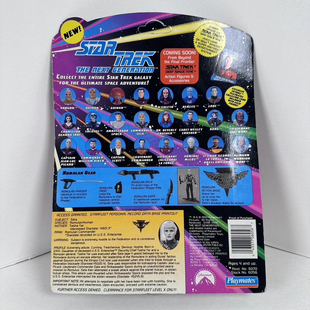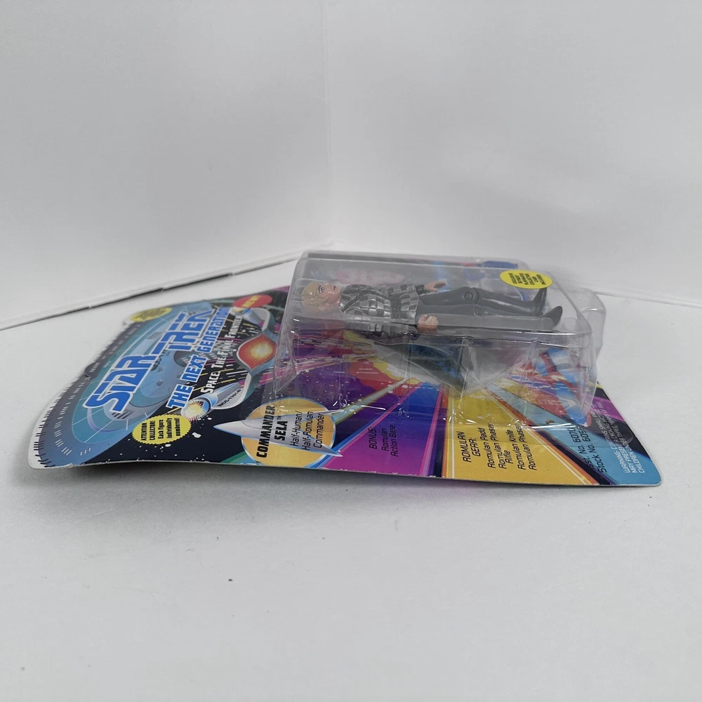Star Trek Next Generation Playmates Commander Sela Action Figure Sealed Produced in 1992 FLAT RATE SHIPPING! This is from my mother collection. Seal is still fully intact, and it is in great condition. Card is only minimaly warped. Stored in a cool dry place. Pet and smoke free home. This will be shipped professionally with additional padding added. I have many other cool retro items listed for sale! Please check out the store page! Thanks! Thank you for your time and intrest! Please contact me if you have any questions!