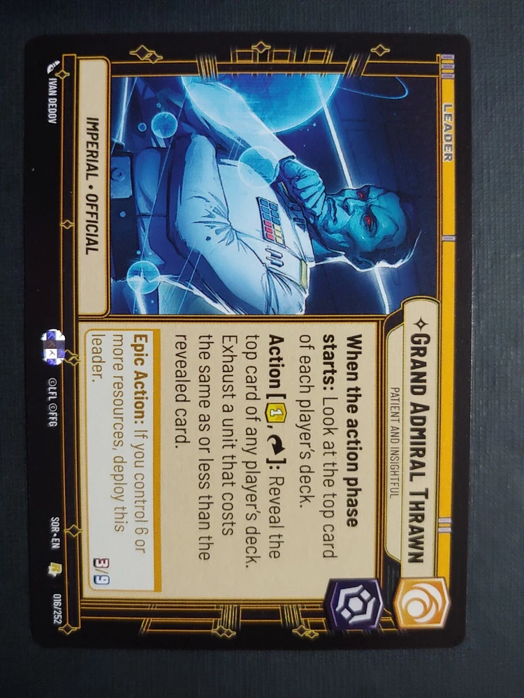 This rare Star Wars Unlimited TCG card features Grand Admiral Thrawn, a patient and insightful leader from the Spark of Rebellion set. Manufactured by Fantasy Flight Games, this collectible card is a must-have for any Star Wars fan. The card's unique attributes include its rarity, the game it is part of, the set it comes from, and the manufacturer responsible for creating it. Add this card to your collection and enhance your gameplay strategy with its powerful effects. This card is perfect for anyone who loves Star Wars, collectible card games, or just wants to add a rare and valuable piece to their collection. Get your hands on this Grand Admiral Thrawn card today!