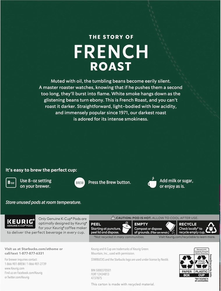 Brand:Starbucksgtin13:0762111355843Compatibility:KeurigUPC:0762111355843MPN:DXTYUTETJCProduct:Coffee Pod & CapsuleNumber of Servings:96Serving Size:1GTIN:0762111355843