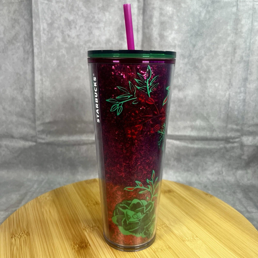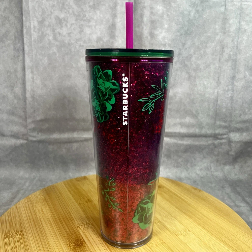 Starbucks Winter Holiday Tumbler Cold Cup 24 oz - Glitter w/ Green Flowers This Starbucks Winter Holiday Tumbler Cold Cup 24 oz is the perfect addition to your collection of coffee and tea accessories. The cup features a glittery design with green flowers, making it a festive and eye-catching piece. It is an original Starbucks product, manufactured in China, and is ideal for enjoying your favorite cold beverage during the holiday season. The cup is labeled as a 24 oz and is perfect for collectors or as a gift for a coffee and tea enthusiast.