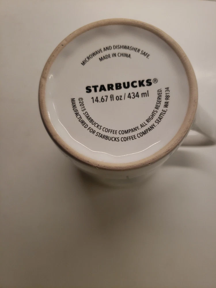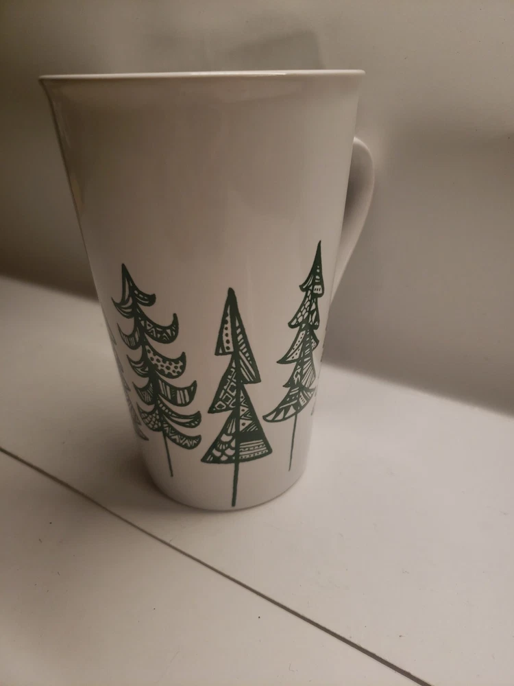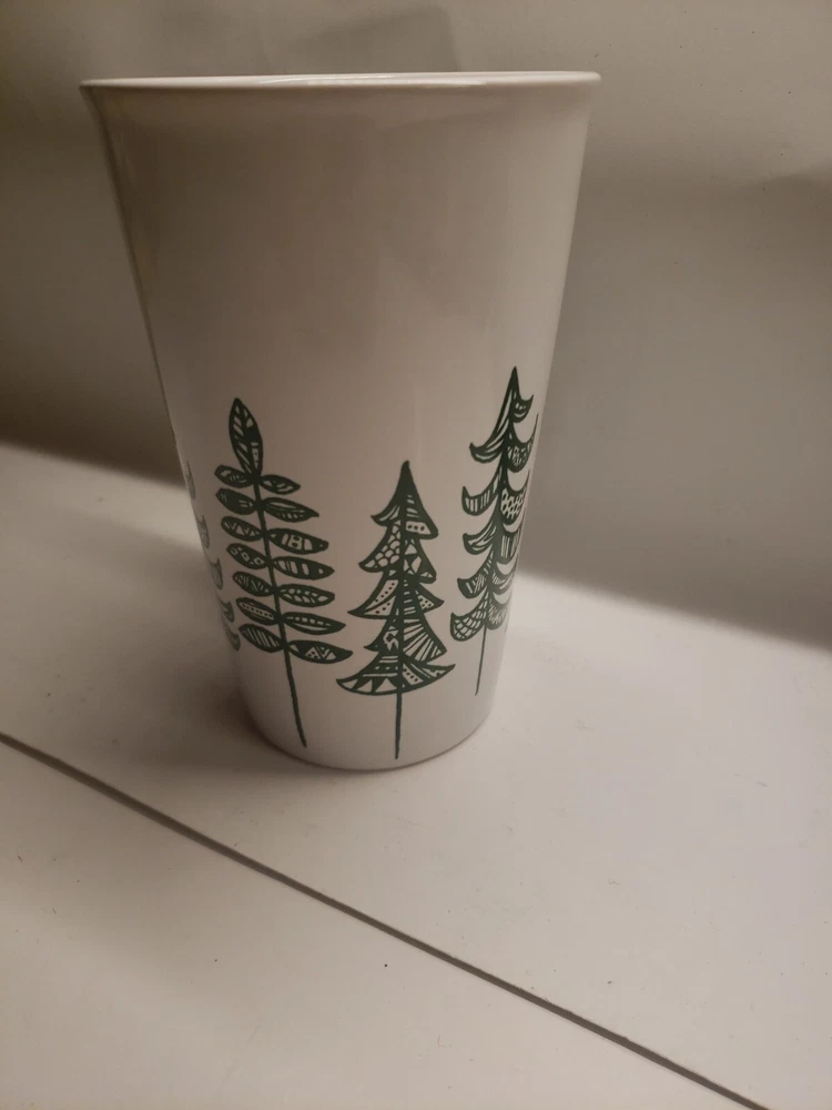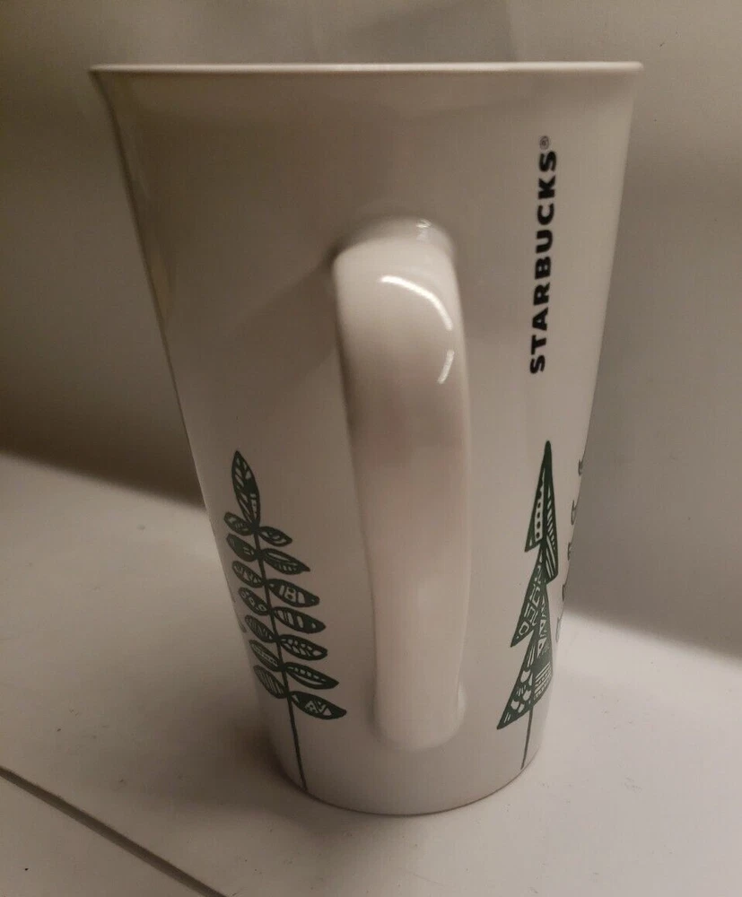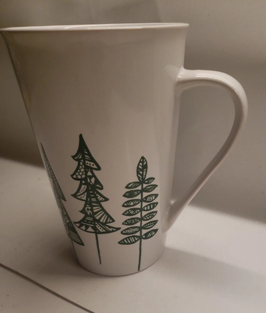 This Starbucks coffee mug features a green and white design with pine trees, making it the perfect addition to any coffee lover's collection.