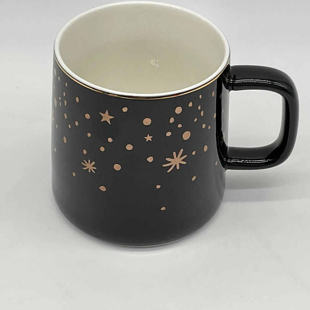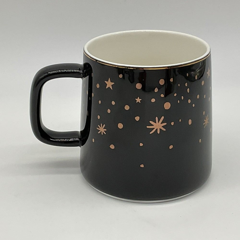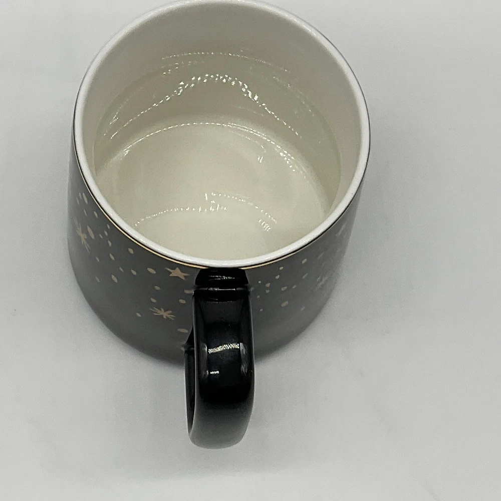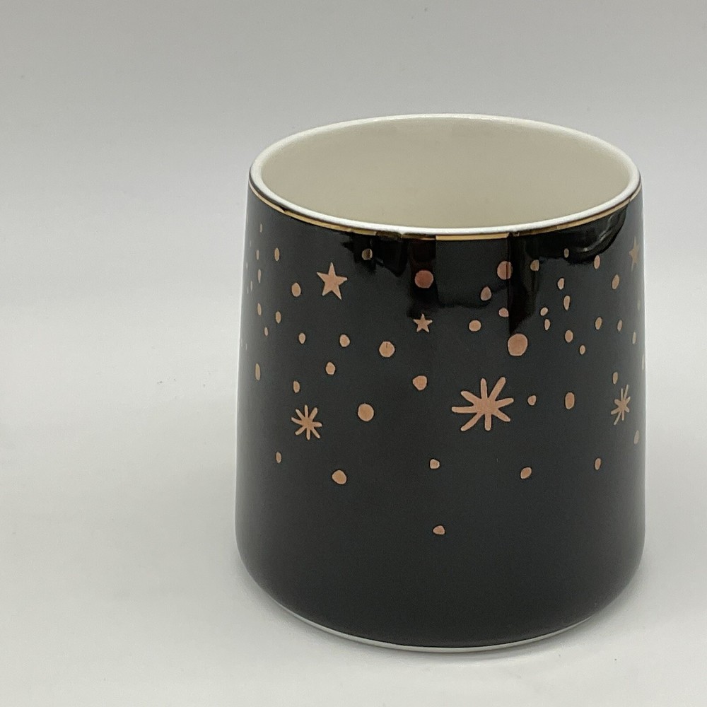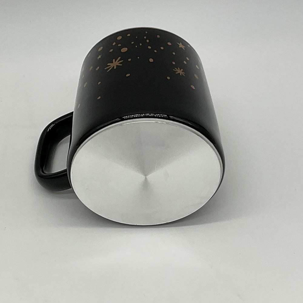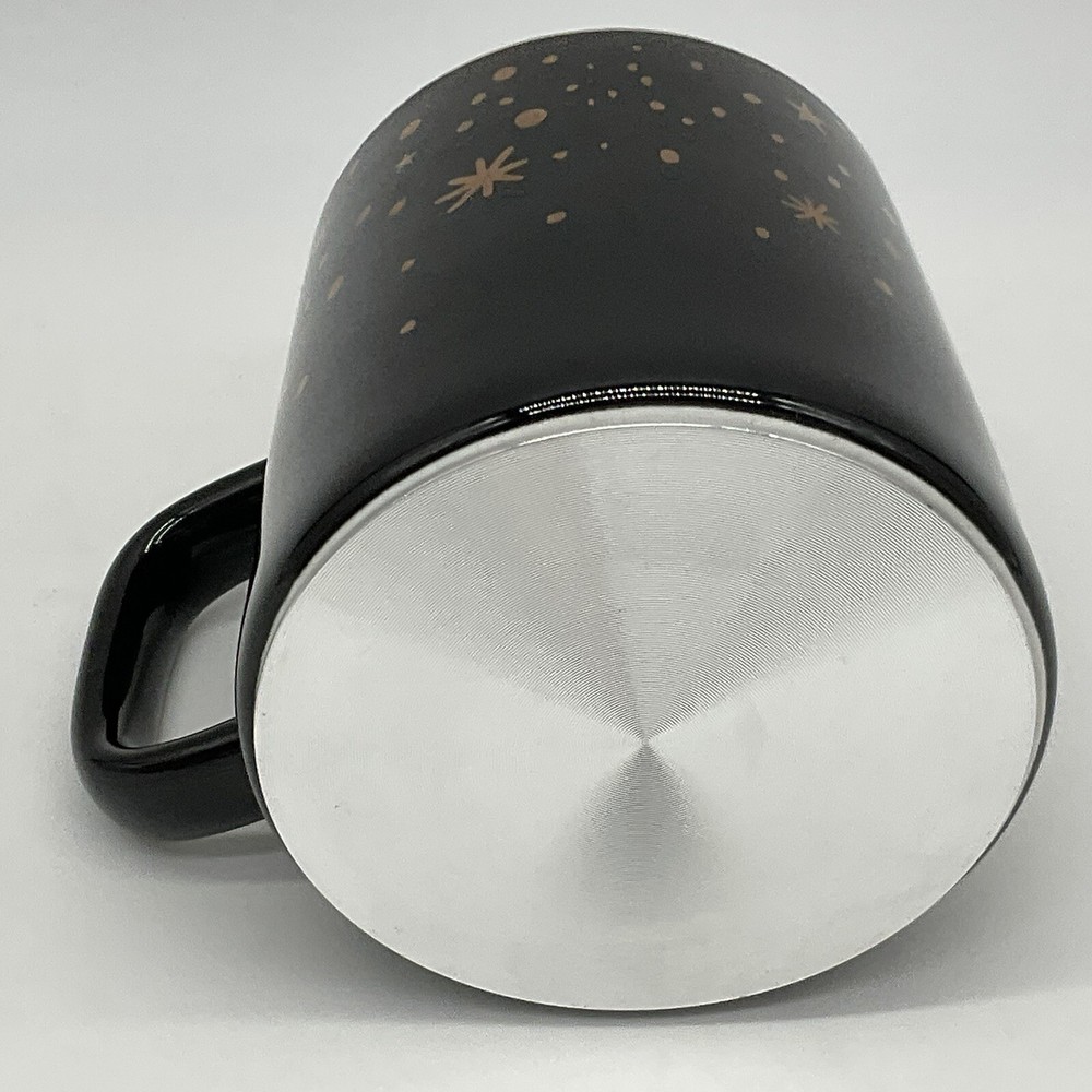 Starry Starry Night mug that accomodates a beverage Heater. Put this mug on a heater plate and enjoy your tea or coffee warmer for a longer period of time 3.5 inches tall 3 inches wide Metal Concentric circles on the bottom of the mug