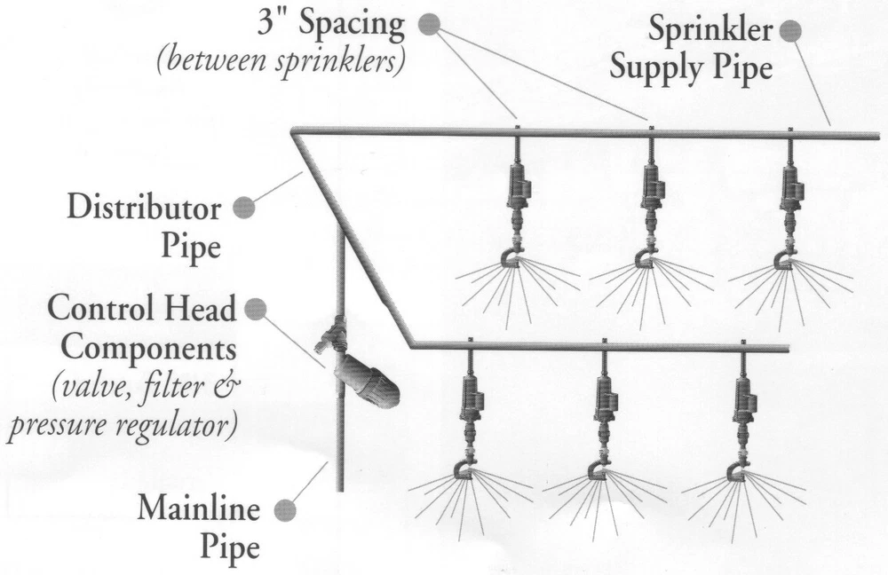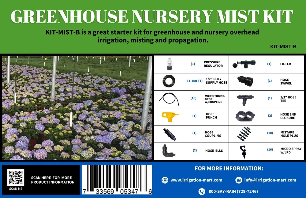 Complete Greenhouse Misting/Propagation System Kit comes in reusable 5 gallon measuring bucket with lid Kit Includes: Pressure Regulator Screen Filter Connection for standard Garden Hose Bibb or faucet 100' main line (1/2" poly header) 16 misting nozzles with LPD (leak prevention/non-drain device). Hole punch/installation tool 2 End closure for poly line 2 Ells 1 Tee 1 Repair Coupler This Kit includes everything to get started with greenhouse irrigation. They come ready to plumb into a standard 3/4" garden hose or faucet. Great for the backyard gardener or if you are just getting started with greenhouse irrigation. System is designed to use over head on benches for starting new cuttings or watering existing plant stock. Misters should be hung 3-4 feet above crop and spaced 3 feet down the 1/2" line to cover up to a 4' wide bench 40-50' long (hang higher for cooling or humidification). These have the LPD feature to prevent drain-down of lines after run times allowing higher uniformity and instant on/off operation (no delay when controller turns on/off valve). No extra pressure needed to operate (30 PSI recommended), works off standard garden hose or faucet . Eliminates the need for hand watering while giving very high uniformity over the table. Other items can be added to complement the system such as controller/timers, fertilizer injectors, more zones/lines, sensors (photo, temperature, and moisture), or a flow meter. This is the same material used by the commercial nursery growers and greenhouses. These can even be used to help lower temperature when operated in the cycle mode with a Mist/Irrigation controller (not included). This system can be expanded for future growth, and the sprinklers are modular to allow for change if the application requires it. The drawing shows a two row set-up with the modular type sprinklers. This kit can be modified to do more rows with extra fittings. Let us Know what you would like to see in our store. Contact us if there are any questions or if you need assistance in system design and/or layout. Thanks For visiting our Irrigation-Mart E-store. 800 SAY-RAIN