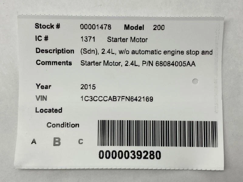 Hollander Welcome to our eBay store! Starter Motor 2.4L 68084005AA Fits 2015-2017 Chrysler 200 81684 Description This listing is for a used Starter Motor. The part pictured is the actual item you will receive, no other parts are included. This part is used so normal wear is to be expected. Please see part fitment information below and please match part numbers before buying this item. If you have any questions please let us know. Donor Vehicle Model : 200 Year : 2015 Mileage : 174000 (0 = not available or unknown) Stock Number : 001478 Notes : STARTER MOTOR, 2.4L, P N 68084005AA 040125 This Part Will Fit These Makes And Models With These Options 200 15-17 (Sdn), 2.4L, w/o automatic engine stop and start CHEROKEE 14-18 2.4L COMPASS 17 new style (horizontal rear door handle), (2.4L), engine ID ED6 COMPASS 18-20 (2.4L), engine ID ED6 FIAT 500 16 2.4L FIAT 500 17 4 Dr, X model, 2.4L PROMASTER CITY 15-18 (2.4L) PROMASTER CITY 19-22 RENEGADE 15-18 2.4L (AT) RENEGADE 19-21 2.4L About Us Payment Shipping Returns Warranty About Us Please contact us with any questions BEFORE purchasing. If you are unsure if this part will fit we are happy to verify fitment for you prior to purchase via your vehicle's VIN (Vehicle Identification Number). We try to answer all messages in 24 hours. Please note that orders are sent to the shipping department throughout the day therefore we cannot guarantee adjustments to orders after payment is received. Our hours of operation are: Monday - Friday 8:00AM - 5:00 PM CST Saturday - Sunday Closed Payment All orders must be paid in full prior to shipment. Payments are processed through eBay. We accept credit card and cash for Local Pickup orders. If payment is not received, an Unpaid Item case will be opened for the sake of seller fee reimbursement. Sales tax will be collected by eBay where applicable. Shipping We ship items via UPS, USPS, or LTL Freight Carriers. Tracking information is uploaded to the order once the item is shipped. Larger items such as Engines, Transmissions, Doors, Tailgates, Trunk Lids, Rear Axles etc. will ship via freight. Freight items are unable to be shipped until we have all the necessary information required by the carrier. Typically that includes a valid business name, address, valid phone number, and hours of operation. Be sure to provide us with all necessary contact information with your order as well. Freight charges are for zoned commercial addresses with a forklift or loading dock. If the location requires the assistance of a lift gate there will be an additonal fee. If a commercial address is not able to be provided we can ship the item to your residence for an additional fee. Add $100 for Residential delivery Add $85 for Liftgate delivery Most orders are shipped within one business day. If there is an issue with your order or item we will reach out to you before we ship the order. Once payment is received for a freight item we will send a message asking for additional information needed for the freight carrier. Without this information we will not be able to ship your item. If a USPS or UPS item is damaged during shipping please keep all packaging and loose parts complete with the package. Send us a message through Ebay with some pictures and your invoice number. We will work on getting a replacement item to you while handling the UPS claim as well. Please Inspect all freight shipments before signing for them at time of delivery! If there has been any damage to the item during shipping inspect the item to see if you can still use it or not. If you can still use the item, notate the damage on the delivery ticket that the driver is keeping then hand it back to them. Send us a message with a copy of your receipt and the delivery ticket you kept. We will take care of the damage claim with the freight carrier. If you cannot use the product simply decline the shipment send us a message and we will work on getting a replacement or refund to you. It is very important to not sign for any damaged product without notating it on the delivery ticket or denying the shipment. You have the right to inspect the package for obvious signs of damage prior to signing and accepting the delivery. If a delivery driver is refusing to let you inspect the shipment before you sign for it, do not sign, refuse the shipment and contact us through eBay messaging. When you sign for the delivery on the carrier's Bill Of Lading (BOL) it is accepting the merchandise as is and in good order. So please inspect your package before signing for it. We do understand that sometimes there will be damage that is missed, don’t worry we will still be able to help you. If you do find concealed damage after you sign for the package let us know through messages and send some pictures as well. We will get with the freight company and start a claim. We are not responsible for any delays incurred by the shipping company. No International shipping is available outside of the eBay Global Shipping program. We do not ship to PO Boxes, Hawaii, Alaska, Puerto Rico, APO, FPO, AA, AE, AP and U.S. Territories outside of the continental U.S. International orders are shipped via eBay’s Global Shipping Program. Customer pickup at our location is also available. Please contact us prior to your purchase to arrange pick up. Returns If you need to return an item for any reason please contact us first to obtain a RMA number (Return Material Authorization). All returns must be authorized by us before being shipped back. Any items returned must include an RMA number clearly written on the side of the packaging. If you are returning a part because you bought the wrong one or no longer need it the original shipping charges are not refunded and you are responsible for the return shipping. All returns must be made within 30 days of the date of purchase. All parts must be returned in their original condition to receive full credit Once you obtain an RMA number, ship the item back to: Frontier Auto Parts, 21