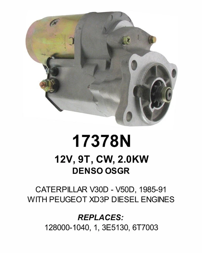 Specifications Description: Starter OEM(s):Replaced Denso Voltage: 12 Power: 2kW / 2.68HP Condition: Remanufactured Rotation: CW Starter Type: OSGR Number of Teeth: 9 Application: Industrial Applications Weight: 12 lbs / 5.45 kg Reference Numbers Caterpillar 3E5130, 6T7003 Denso 128000-1040, 128000-1041, 280-7025 Hyster 3060174 Lester 17378 PIC Picture ID 190-521 Applications Caterpillar Ag. & Ind. T40D 1985-1991 Peugeot XD3P Dsl Caterpillar Ag. & Ind. T40D 1992-2001 Peugeot XD3P Dsl. Caterpillar Ag. & Ind. T45D 1985-1991 Peugeot XD3P Dsl Caterpillar Ag. & Ind. T50D 1985-1991 Peugeot XD3P Dsl Caterpillar Ag. & Ind. T50D 1992-2001 Peugeot XD3P Dsl. Caterpillar Ag. & Ind. T55D 1985-1991 Peugeot XD3P Dsl Caterpillar Ag. & Ind. T60D 1985-1991 Peugeot XD3P Dsl Caterpillar Ag. & Ind. TC60D 1985-1991 Peugeot XD3P Dsl Caterpillar Ag. & Ind. TC60D 1992-2001 Peugeot XD3P Dsl. Caterpillar Ag. & Ind. V30D 1985-1991 Peugeot XD3P Dsl Caterpillar Ag. & Ind. V35D 1985-1991 Peugeot XD3P Dsl Caterpillar Ag. & Ind. V40D 1985-1991 Peugeot XD3P Dsl Caterpillar Ag. & Ind. V40D 1992-2001 Peugeot XD3P Dsl. Caterpillar Ag. & Ind. V45D 1985-1991 Peugeot XD3P Dsl Caterpillar Ag. & Ind. V50D 1985-1991 Peugeot XD3P Dsl Caterpillar Ag. & Ind. V50D 1992-2001 Peugeot XD3P Dsl. Caterpillar Ag. & Ind. V50E 1985-2001 Peugeot XD3P Dsl. Caterpillar Ag. & Ind. VC30D - VC60D 1985-1991 Peugeot XD3P Dsl Caterpillar Ag. & Ind. VC30D - VC60D 1992-2001 Peugeot XD3P Dsl. Terms and Conditions - Contact Information Contact Info If there is any problem with your purchase please contact us via our eB ay store before going through eBay by clicking on Ask a Question button near the bottom of the page. Damaged Product If the product is damaged in shipping please send pictures within 24 hours and we can start process of filing a claim and get a replacement out to you.... Return s Buyers are responsible to check what they have befor e ordering . DO NOT ORDER OFF TITLE ALONE When returning products to us you MUST provide: Item Number Buyer ID Your Address Your Phone Number Reason for Return and provide Tracking . We only offer refunds if the return is handled within the first 30 days (as per our eB ay policy) so any returns after the 30 day period will be via repair or replacement. New returns are subject to 20% restocking fee and buyer is responsible for all return shipping costs on any new return. WHICH INCLUDE NO LONGER NEEDED, BOUGHT WRONG PART, NOT COMPATIBLE OR USEFUL, WRONG WEBSITE DESCRIPTION (EXPLAIN) ARRIVED TOO LATE. M ust provide original delivery dates and the actual delivery date . Any warranty return after 30 days, buyer is responsible for return shipping costs. If item fails within 30 days we provide a return shipping label. 30 days after purchase we DO NOT offer refunds on ANY returns, just repairs, but buyer is responsible for shipping costs to return the product. Any item taken APART or DEFACED or SIGNIFICANTLY DIFFERENT which include being DIRTY and returned broken are subject to 50% restock Issues with Order If you get an item "that isn' t as described" please be clear in stating what is different about the listing and the product you received. On rare occasions we do have shipping errors but ordering a starter because it looked the same is not "item not as described". There are many starters that look very similar to others and unless you are certain the product you order is correct prior to ordering we consider it to be user error. Please send a message to us to confirm the product you order is correct prior to ordering. We have experienced technicians who can help you be certain you get the right product for your needs. Pictures Pictures are NOT always of the exact product. Sometimes an OEM picture may be used or a different color product ( ie different color pulley, stickers or other tags) but the purpose of the picture is to provide you with the style and specs of the product. If one of our products is OEM we state it as such in the PART BRAND section of item specifics. We sell OEM and aftermarket products. If you aren't sure please ask prior to purchasing. Warranty Most of the returns we get either are 100% fu n ctional products or have a simple problem such as bad battery or dirty/loose/misconnected cables. Please make sure you contact us to see if we can help you resolve any issues before diagnosing a product as warranty. If you take our product to a shop to test and pay to have it tested, please insist on a copy of the results as we will require it in order to approve return. Any warranty return after 30 days, buyer is responsible for return shipping costs. If item fails within 30 days we provide a return shipping label. 30 days after purchase we attempt to repair the part, if unsuccessful we will send a replacement , but buyer is responsible for shipping costs to return the product. You have a 1 year warranty from date of purchase on the original bought part. Shipping Times Please note that shipping times on eB ay are estimates . We ship from multiple locations and generally our product arrives faster than the estimated times but on occasion that won' t be the case due to shipping carrier, weather, etc. If you need it by a specific day please confirm prior to ordering or upgrade to the next day service. If you order on a Friday at 3PM CST your product will not ship until Monday. We ship our eBay orders up until 3PM CST. Again, if you need faster please order accordingly. We do not ship product on weekends or holidays. International Orders We only ship internationally via the eB ay Global Shipping Program. We assume no liability for any costs incurred outside of the United States. All customs or import duties are the sole responsibility of the buyer as are any other possible fees regarding shipping costs. Please to be sure we ship to your country before you try and order. ANY AND ALL RETURNS ARE BUYER RESPONSIBIL I TY TO RETURN . Fitment Compare your part with the one in the picture. Please read the entire listi
