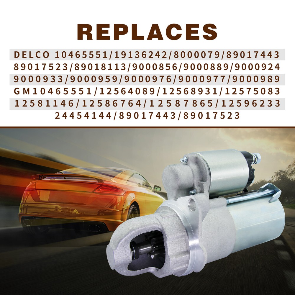 NOTE: Please check fitment information before purchase. If you are not sure about the fit, feel free to contact us! Description Condition: 100% New KWs: 1.2 Teeth: 9 Lester_numbers: 6487, 6493, 6524, 6943, 6944 Pulley_Class: Voltage: 12 Rotation: CW Design: PMGR Part_type: Starter Replace Part Number GM: 12568931, 24454144, 10465551, 12564089, 12575083, 89017443, 12586764, 12587865, 89017523, 12581146, 89017756, 12596233, 89018113 Saab: 24-454-144 Teledyne: TM27M00520 Delco: 9000989, 9000889, 9000924, 10465551, 9000856, 19136242, 89017443, 89017523, 9000933, 9000976, 9000977, 9000959, 8000079, 89018113 Lester: 6487, 6524, 6493, 6943, 6944 Arrowhead: SDR0308, SDR0277, SDR0346, SDR0467 Arrowhead Old: SDR0098 AC-Delco: 336-1933A, 336-2145A, 336-1933, 323-1456, 323-1486, 323-1620, 323-1632, 323-1642 Advance Auto Parts: 20180020 BBB Ind: 6524, 6493, 6944 BBB New: N6493 Bosch Remanufactured: SR8630X Cardone Select: 39-6493SN Carquest: 6524S, 6493S, 6944S Carquest New: 6493SN TYC: 1-06493 Remy Remanufactured: 25491, 17381, 25902, 96213, P6502S, 26642, P6698 J & N Automotive: 410-12240, 410-12287, 410-12600 Hollander: 887 MPA: 6487S, 6493S, 6944S MPA New: 6493SN NAPA: 246-5169, 246-5143, 246-5149, 246-5165 NAPA Pro Series: 76183, 76181 Rayloc: 46-5143, 465143, 465149, 2465165 Rayloc New: 4N5143 Remy New: 96213 Wilson: 91-01-4676, 91-01-4519, 91-01-4697 Wilson New: 91-01-4519N Dixie Electric: S-1466, S-1482, S-1495 Excel: 21391, 2058, 2078 Andre Niermann: 010977 Fitments CHEVROLET: Malibu L4 2.2L 04-07 HHR L4 2.4L 06-07 HHR L4 2.2L 06-07 Cobalt L4 2.4L 06-07 Cobalt L4 2.2L 05-07 Cobalt L4 2.0L 05-07 Classic L4 2.2L 04-05 Cavalier L4 2.2L 02-05 SATURN: Vue L4 2.4L 07-07 Vue L4 2.2L 02-07 Sky L4 2.4L 07-07 Sky L4 2.0L 07-07 LW200 L4 2.2L 01-03 L300 L4 2.2L 04-04 L200 L4 2.2L 01-03 L100 L4 2.2L 01-02 Ion L4 2.4L 06-07 Ion L4 2.2L 03-07 Ion L4 2.0L 04-07 SAAB: 9-3 L4 2.0L 03-03 PONTIAC: Sunfire L4 2.2L 02-05 Solstice L4 2.4L 06-07 Solstice L4 2.0L 07-07 Pursuit L4 2.4L 06-06 Pursuit L4 2.2L 05-06 Grand Am L4 2.2L 02-05 G6 L4 2.4L 06-07 G5 L4 2.4L 07-07 G5 L4 2.2L 07-07 OLDSMOBILE: Alero L4 2.2L 02-04