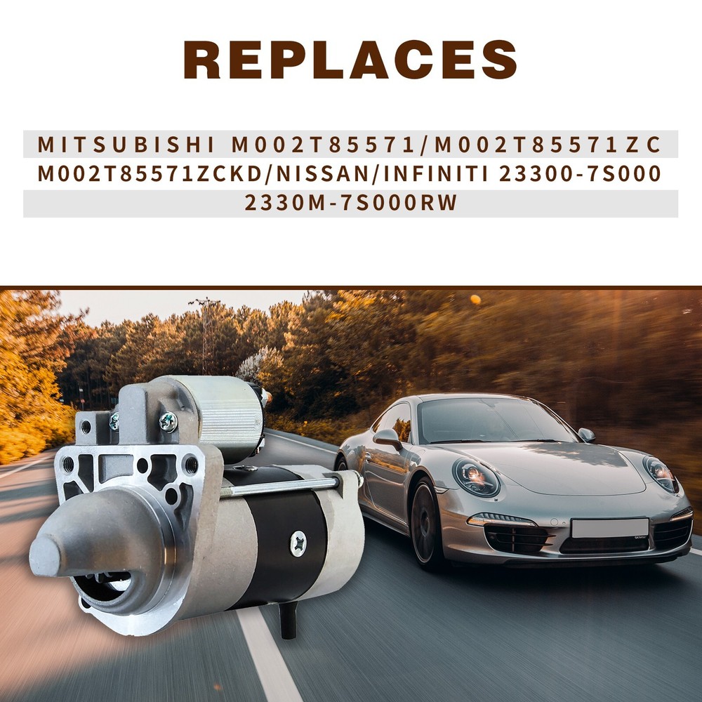 NOTE: Please check fitment information before purchase, if you are not sure about the fit please feel free to contact us! Product Description Condition : 100% New Voltage : 12V KW : 2.2 Teeth : 10 Lester Number : 17867 Manufacturer (MFR) : Mitsubishi Rotation : CW Design : PLGR Part Type : Starter Also See : M2T85571 Replace Part Numbers Nissan, Infiniti : 23300-7S000, 2330M-7S000RW Mitsubishi : M002T85571, M002T85571ZC, M002T85571ZCKD Lester : 17867 Arrowhead : BSR2290X, SMT0283 AC-Delco : 336-1964 BBB Ind : 17867 BBB New : N17867 Bosch New : SR2290N Bosch Remanufactured : SR2290X Carquest : 17867S TYC : 1-17867 Remy Remanufactured : 17430 J & N Automotive : 410-48228 Denso First Time Fit : 280-4249 MPA : 17867 NAPA : 244-6930 NAPA Pro Series : 17867 Rayloc : 446930 Rayloc New : 4N6930 Wilson : 91-27-3321 Dixie Electric : S-80325 Mitsubishi Sales : M2T85571, M2T85571ZC, M2T85571ZCKD Excel : 21410 COMPATIBILITY CHART Infiniti QX56 (2004-2011) Model : Base Sport Utility 4-Door Engine : 5.6L 5552CC V8 GAS DOHC Naturally Aspirated Nissan Armada (2004-2011) Model : LE Sport Utility 4-Door / SE Sport Utility 4-Door Engine : 5.6L 5552CC V8 GAS/FLEX DOHC Naturally Aspirated Nissan Pathfinder (2004-2011) Model : LE/SE Sport Utility 4-Door Engine : 5.6L 5552CC V8 GAS DOHC Naturally Aspirated Nissan Titan (2004-2011) Model : LE/SE Crew Cab Pickup 4-Door / LE/SE Extended Cab Pickup 4-Door / PRO-4X Crew/Extended Cab Pickup 4-Door / XE Crew/Extended Cab Pickup 4-Door Engine : 5.6L 5552CC V8 GAS/FLEX DOHC Naturally Aspirated