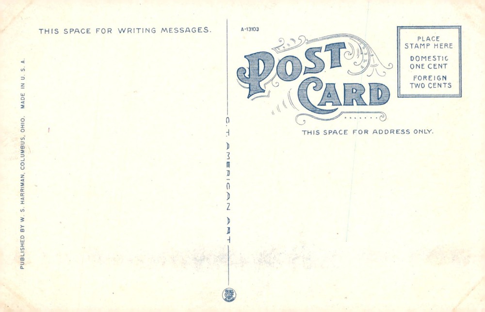 Vintage American postcard featuring the State Capitol in Columbus, Ohio. Published by W. S. Harriman, this postcard provides space for writing messages and address. Stamp placement instructions included.