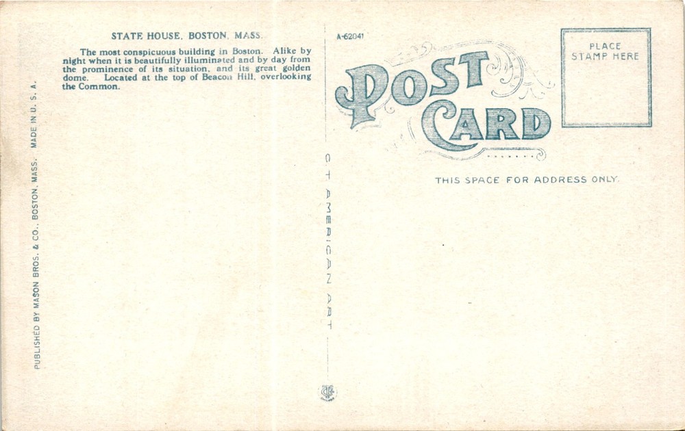 The postcard features an image of the State House in Boston, Massachusetts. The State House is described as the most conspicuous building in Boston, with its beautiful illumination at night and prominent location on top of Beacon Hill. The building is known for its great golden dome and overlooks the Common park.The Massachusetts State House is located in Boston, the capital of Massachusetts.