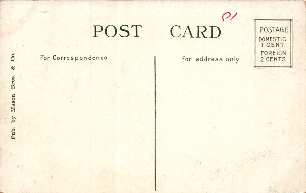 The front of the postcard features an image of the State House in Boston, Massachusetts, and it was published by Mason Bros. & Co. The back of the postcard includes instructions for postage, stating that domestic postage is 1 cent and foreign postage is 2 cents.The Massachusetts State House is located in Boston and serves as the state capitol building.