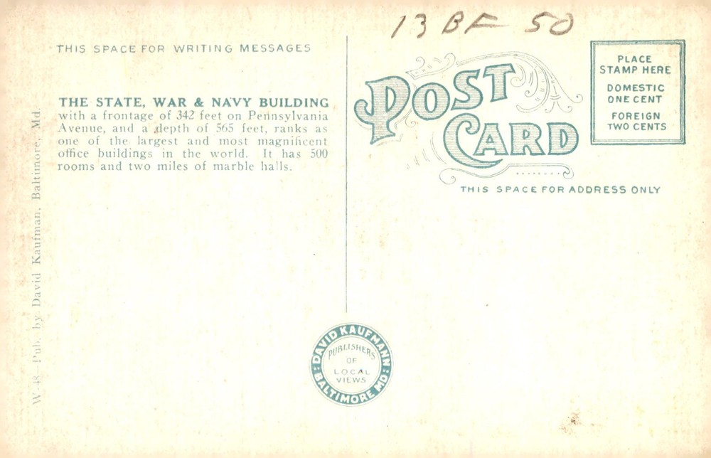 The State, War & Navy Building in Washington, D.C. is a grand office building with 500 rooms and two miles of marble halls, boasting a frontage of 342 feet on Pennsylvania Avenue.