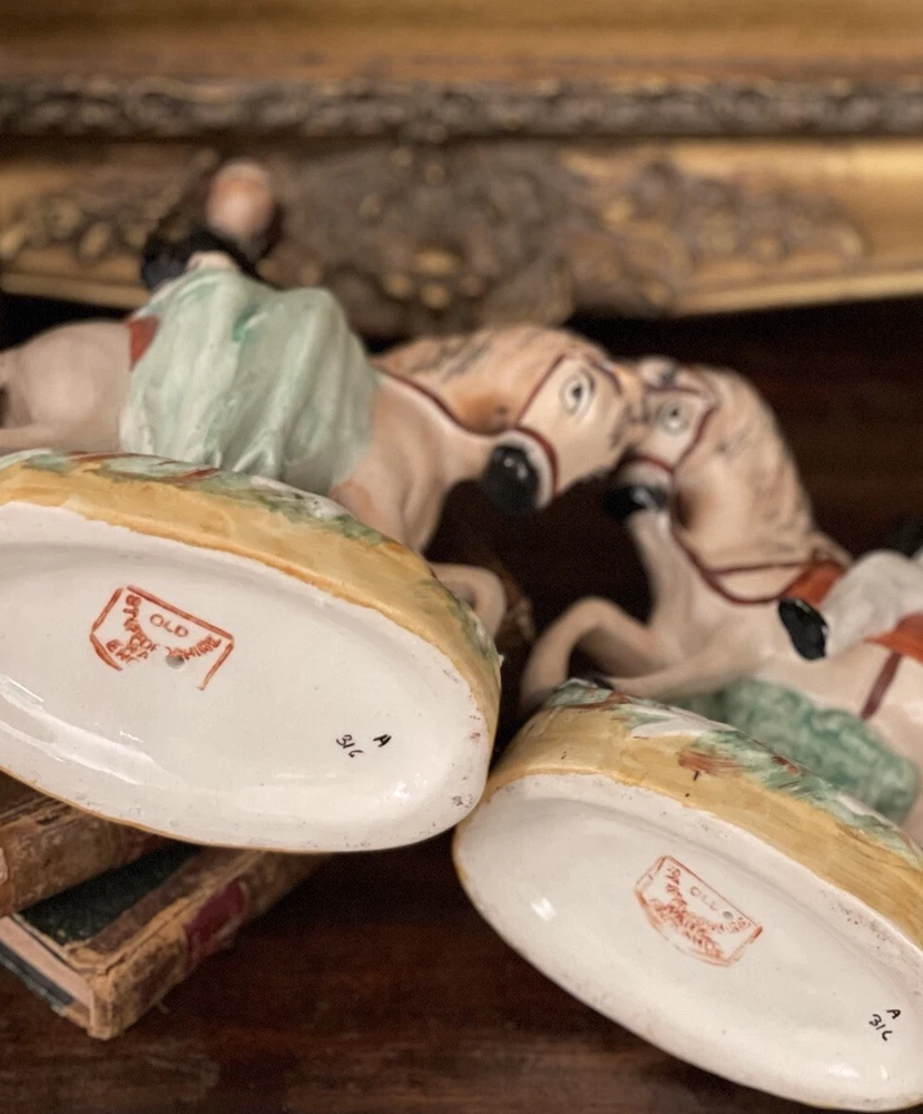 Stunning Rare Antique English Staffordshire Equestrian Mantle Flatback Pair Depicting Elegant Noble Prince and Princess on Horseback β’ Rare Gallery Quality Equestrian Figures β’ Height 7.5β I am delighted to offer this lovely pair of timeless equestrian themed mantle flatbacks featuring elegant right and left facing horses carrying prince and princess (Victoria and Albert) dressed in beautiful riding clothes in classic form from Staffordshire, England. This marvelous statement pair of noble equestrian figures will make elegant showpieces when placed on their own or as a stunning addition to a collection or arrangement. Excellent condition. Marvelous surviving period examples to own and treasure. Turn of century marks to bases. Happy Bidding!! Height 7.5β