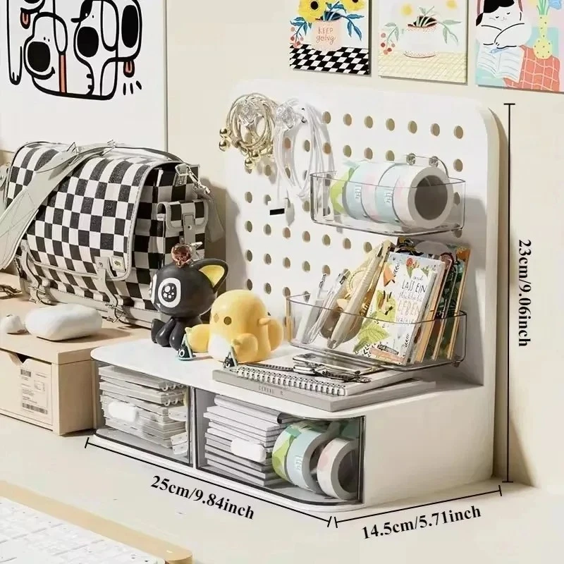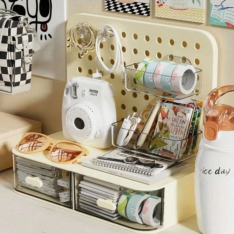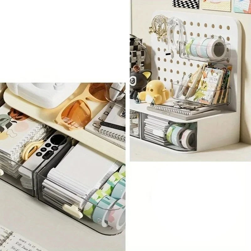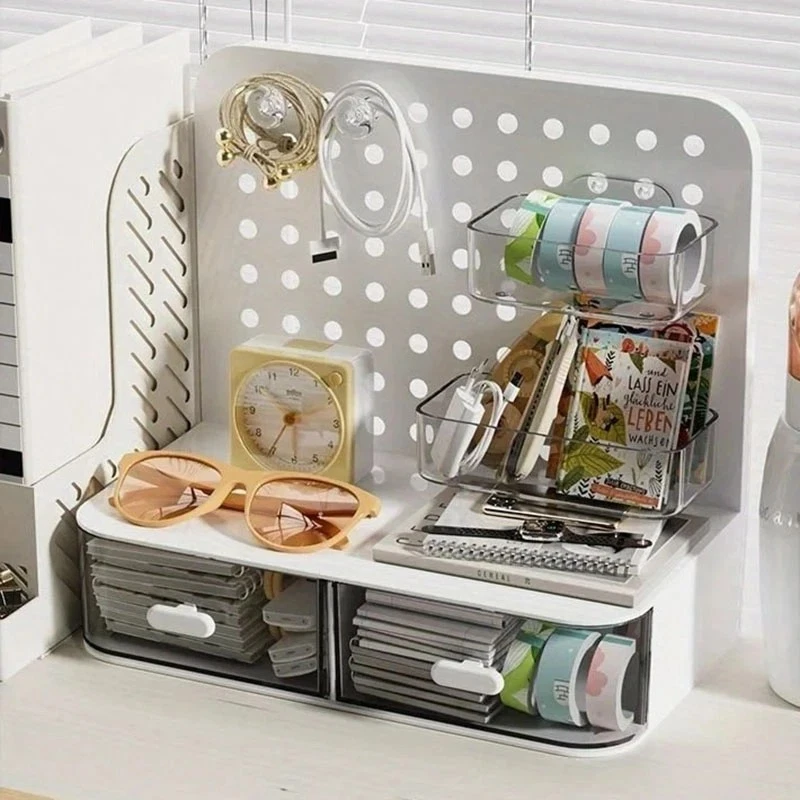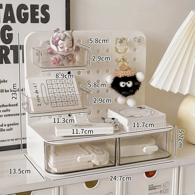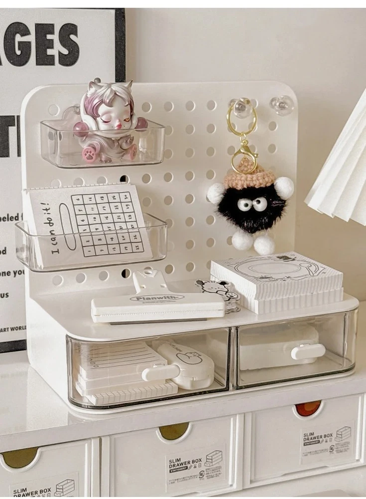 ATTENTION !!! No Extra Fees for US Buyers. Import charges are already included on the price. Stationery Boxes Plastic Storage Board with Drawer Desktop Makeup Organizer Rack Keep your workspace neat and organized with this stylish desktop perforated storage board. Designed with multiple compartments and a drawer, it provides an efficient solution for sorting stationery, pens, makeup, and sundries. The perforated design ensures easy access to your items while maximizing vertical space on your desk. Whether you’re organizing office supplies or storing makeup and small accessories, this versatile organizer helps declutter your desk while adding a modern touch to your space. Compact yet spacious, it’s perfect for both home and office use. Feature: Eco-Friendly:With a 105℃ specification, it ensures safe, eco-conscious storage. Ample Storage: Features a drawer and perforated board design for extensive stationery storage. Material Quality:Crafted from durable plastic, this stationery organizer withstands daily use. Versatile Use:Not just for stationery, it's a versatile makeup storage organizer as well. Space-Saving Design:Compact and perforated, it maximizes desk space without clutter. Specification: Item: Storage Holders & Racks Type: Non-folding Rack Material: Plastic Size: 25x14.5x23cm 24.7x13.5x23cm Color: Transparent Feature: With Drawer Use: Makeup Storage Organizer, Stationery Storage Boxes Pen Sundries Sorting Storage Rack Package Included: 1 x Pc Storage Holders