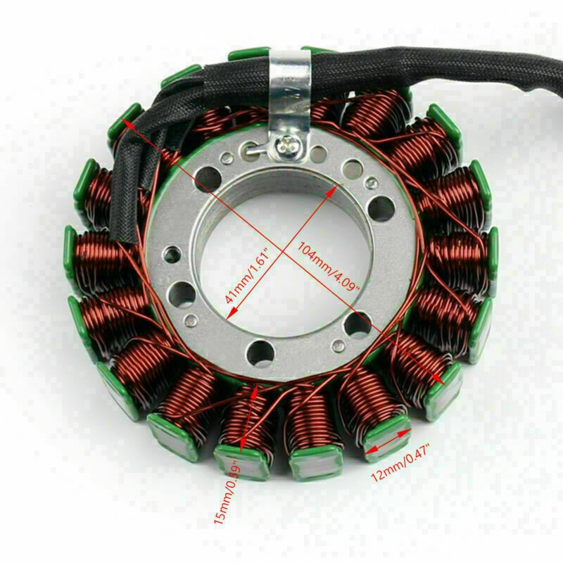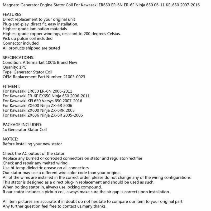 IGNITION STATOR + REGULATOR + GASKET FOR BETA RR 250 300 RACING 2T 2013-2023 95.65 USD Free shipping IGNITION STATOR ALTERNATOR W/GASKET FOR KAWASAKI KX250A 74-1976 KX250 2005-2007 93.65 USD Free shipping Magneto Coil Stator Regulator Gasket Set For Yamaha XV 250 Virago 250 1988-1990 75.65 USD Free shipping STATOR GENERATOR REGULATOR RECTIFIER GASKET FOR YAMAHA WR450F YZ450FX 2016-2018 103.65 USD Free shipping Magneto Stator+Voltage Rectifier + Gasket For Suzuki SV1000 SV1000S 2003-2007 US 135.65 USD Free shipping Product Description Magneto Generator Engine Stator Coil For Kawasaki ER650 ER-6N ER-6F Ninja 650 06-11 KEL650 2007-2016 FEATURES: Direct replacement to your original unit Plug-and-play, direct fit, easy installation. Highest grade lamination materials Highest grade copper windings, resistant to 200 degrees Celsius. Pick up pulsar coil included Connector included All products shipped are tested SPECIFICATIONS: Condition: Aftermarket 100% Brand New Quanity: 1PC Type: Generator Stator Coil OEM Replacement Part Number: 21003-0023 FITMENT: For Kawasaki ER650 ER-6N 2006-2011 For Kawasaki ER-6F EX650 Ninja 650 2006-2011 For Kawasaki KEL650 Versys 650 2007-2016 For Kawasaki ZX600 Ninja ZX-6R 2006 For Kawasaki ZX600 Ninja ZX-6RR 2005 For Kawasaki ZX636 Ninja ZX-6R 2005-2006 PACKAGE INCLUDED: 1x Generator Stator Coil NOTICE: Before installing your new stator Check the AC output of the stator. Replace any burned or corroded connectors on stator and regulator/rectifier Check and repair any melted wiring. Use hi-temp dielectric grease on all connectors Our stator may use a different wire color code than your original. All of the wires are installed in the correct order; please do not change any of the wiring configurations. This stator is designed as a direct plug-in replacement and should be used as such. When bolting stator in, always use locking compound. If our stator includes a pickup coil, always make sure the air gap is correct upon installation. All item pictures are accurate; if in doubt do not hesitate to compare our item to your original part. About Us Bruce & Shark is a company Focus on Motorcycle parts more than 11 years. The design inspiration comes from the awe of the vast sea and worship of the fighting sharks, therefore Bruce & Shark takes a shark as brand logo. Since its inception, we have always put the "customer first" and "top quality" as our principle. We specialized in selling Motorcycle parts and providing customers with various types of high-quality products. Our brand Bruce & Shark has enjoyed good reputation in America, Europe, Japan, Canada and Africa, covering more than 30 countries. Our vision is to deliver high-quality Auto parts and Motorcycle parts products and sincere services to the world. Our main products are car headlight, Grille, engine part, car body trims and motorcycle mounted, fuel pump, stator, windshield, Seat Cover, motorcycle fairing. Welcome to our shop to choose products that are worth more for your vehicles! Please Add me to your list of favorite sellers and visit often. Thank you for your business. Shipping United States Buyers Parcel will be sent via USPS or UPS or FedEx from our United States Warehouse. Shipping Time Usually parcel will be delivered 2-10 working days include handling time. Sometimes shipping time may has a little delay, such as Bad weather, Holidays. Terms We stand behind everything that we sell and will do everything possible to assure you are satisfied. When you receive your purchase if you are not 100% satisfied, please sent me ebay message and we will do our best to make you happy. If you still want to return your purchase, simply ship the item(s) back to us and we will refund your original purchase price and the original shipping charge. Buyers are responsible for the postal cost of returning the items. We must be notified of the intent to return your item within 30 days of receiving the item. Items returned must be in the same condition that they were received. How to return 1,Please ask us for return address . 2,Shipping back the package . The RMA#(Return Merchant Authorization Number = Your ebay ID) must be clearly written on the return package ,Otherwise the package will be refused. 3,Sent us the return tracking number. 4,All returns will be inspected prior to a credit being issued. Contact Us Send us ebay message in English If you have any questions, our Customer Service staffs welcome you to sent me ebay message. We strive to answer all questions and resolve any problems as quickly as possible. Business Hours: HongKong Time GMT+8:00 Monday-Saturday 9:00-17:00 Copyright © Bruce&Shark All rights reserved