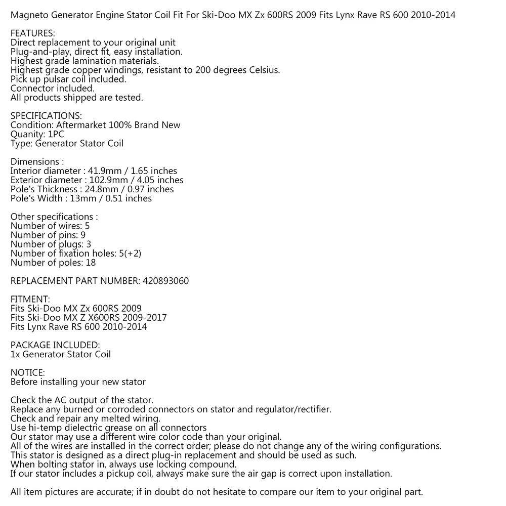 You may also like Voltage Regulator Rectifier For Arctic Cat 570 2000 Snowmobile 0630-230 0630-321 64.85 USD Free shipping Voltage Regulator For Ski-Doo Grand Touring 700 800 98~01 515175461 515170600 H1 33.85 USD Free shipping Generator Magneto Stator Coil Fits Legend Skandic Expedition V 800 07 08 92.85 USD Free shipping Rectifier Regulator Fit for Polaris 400 440 500 600 680 700 800 Indy RMK 4060123 20.85 USD Free shipping Rectifier Regulator Fit for Arctic Cat 340 440 550 580 600 Snowmobile 1990-2007 18.85 USD Free shipping Voltage Regulator Fit for Arctic Cat Sno Pro M800 XF800 LXR 0630-250 0630-323 T9 52.85 USD Free shipping Stator Generator fit SkiDoo 600 700 800 420889905 410922946 410922965 410922993 82.85 USD Free shipping Voltage Regulator Rectifier for Polari 600 700 800 IQ Snowmobile 07-12 4012476` 39.85 USD Free shipping Voltage Rectifier Regulator For Polaris 440 500 600 Snowmobile 4010301 4010793 A 19.85 USD Free shipping Voltage Regulator Fit for Ski-Doo GTX GSX 600 HO SDI 515176243 515175717 H10 38.85 USD Free shipping Voltage Regulator Rectifier Fits SKI DOO EXPEDITION GSX GTX MX Z SKANDIC 600 h1 31.85 USD Free shipping STATOR + VOLTAGE REGULATOR + GASKET FOR YAMAHA VECTOR RS90 VENTURE RST90 05-09 112.85 USD Free shipping Generator Stator Regulator Gasket For Yamaha SR Viper LTX RTX MTX STX 2015-2018 129.85 USD Free shipping Voltage Regulator Fit Arctic Cat Firecat Sabercat 500 600 700 03-05 0630-170 U2 37.85 USD Free shipping Voltage Regulator Fit for ARCTIC CAT ZR 120 FIRECAT BEARCAT 700 900 2005-2019 h1 29.31 USD 30.85 USD Free shipping 5% off Stator Magneto For Ski-Doo Skandic Expedition Legend V800 420684853 420684852 H0 80.85 USD Free shipping NEW-00004 STATOR GENERATOR ALTERNATOR for SKI-DOO MXZ LYNX RAVE RS600 SNOWMOBILE S2 Magneto Generator Engine Stator Coil Fit For Ski-Doo MX Zx 600RS 2009 Fits Lynx Rave RS 600 2010-2014 FEATURES: Direct replacement to your original unit Plug-and-play, direct fit, easy installation. Highest grade lamination materials. Highest grade copper windings, resistant to 200 degrees Celsius. Pick up pulsar coil included. Connector included. All products shipped are tested. SPECIFICATIONS: Condition: Aftermarket 100% Brand New Quanity: 1PC Type: Generator Stator Coil Dimensions : Interior diameter : 41.9mm / 1.65 inches Exterior diameter : 102.9mm / 4.05 inches Pole's Thickness : 24.8mm / 0.97 inches Pole's Width : 13mm / 0.51 inches Other specifications : Number of wires: 5 Number of pins: 9 Number of plugs: 3 Number of fixation holes: 5(+2) Number of poles: 18 REPLACEMENT PART NUMBER: 420893060 FITMENT: Fits Ski-Doo MX Zx 600RS 2009 Fits Ski-Doo MX Z X600RS 2009-2017 Fits Lynx Rave RS 600 2010-2014 PACKAGE INCLUDED: 1x Generator Stator Coil NOTICE: Before installing your new stator Check the AC output of the stator. Replace any burned or corroded connectors on stator and regulator/rectifier. Check and repair any melted wiring. Use hi-temp dielectric grease on all connectors Our stator may use a different wire color code than your original. All of the wires are installed in the correct order; please do not change any of the wiring configurations. This stator is designed as a direct plug-in replacement and should be used as such. When bolting stator in, always use locking compound. If our stator includes a pickup coil, always make sure the air gap is correct upon installation. All item pictures are accurate; if in doubt do not hesitate to compare our item to your original part. ⭐ COMPATIBILITY CHECKLIST ✔ Check description and vehicle compatibility chart ✔ Compare OEM numbers ✔ Review connector photos ✅ Free verification: Message us first 1: Full VIN (17-digit) 2:OEM # from your original part 3:Old part photos 4:Vehicle Year/Make/Model/Engine Size Shipping Return Warranty Feedback ✔ Order Processing: Ships within 3 business day (Mon-Fri, excludes holidays). ✔ Delivery Time: 7-10 business days (continental U.S.). ✔ Tracking Info: Provided automatically via eBay. ✔ All orders will be shipped through USPS. ✔ Shipping notification will be emailed to you once package has been shipped ✅Fast & Reliable Shipping – Your order is our priority! ✅We package all items with care to ensure safe arrival! ✅ International Shipping: Available to 50+ countries (calculated at checkout). Customs/duties may apply for international orders. If you don't receive the parcel after 10 business days (after shipment), please feel free to contact us first, we can resend or refund to you. We Want You to Love Your Purchase! 💙 Our 60-day return policy protects you: ⭐ STEP 1: Message Us First - we often solve issues without returns! ⭐ STEP 2: If the return is due to change of mind, select "Didn't like item" or "Ordered by mistake" . For tem not as described, provide details and photos to help us assist you promptly. Why Contacting Us First Helps You: • Faster solutions (often within 48 hours !) • Possible instant refund or replacement options • Personalized return instructions for your case For Your Protection: • We carefully inspect all returns • Please use tracking when shipping back • "Not as described" returns require photos/video for fastest resolution Help us serve you better by contacting us first! 😊 ⭐ HASSLE-FREE WARRANTY • 90-365 Day Coverage (varies by product - see listing details) ❌ Exclusions: 🔸Physical damage (drops/accidents) 🔸Installation errors (YouTube tutorial links provided) 🔸Modified/tuned vehicles ⚠️ Claim Process: 🔹Message us with video proof + order # 🔹Get prepaid return label (if approved) 🔹Choose: Replacement / Refund 📢 Our Feedback Promise ⭐ Your Satisfaction Matters Most! We work hard to earn your 5-star experience. Before leaving feedback, please: 1️⃣ Contact us first if there’s any issue – we’ll make it right! 2️⃣ Verify your item meets expectations (check sizing/compatibility if applicable) 3️⃣ Allow reasonable time for shipping/delivery 