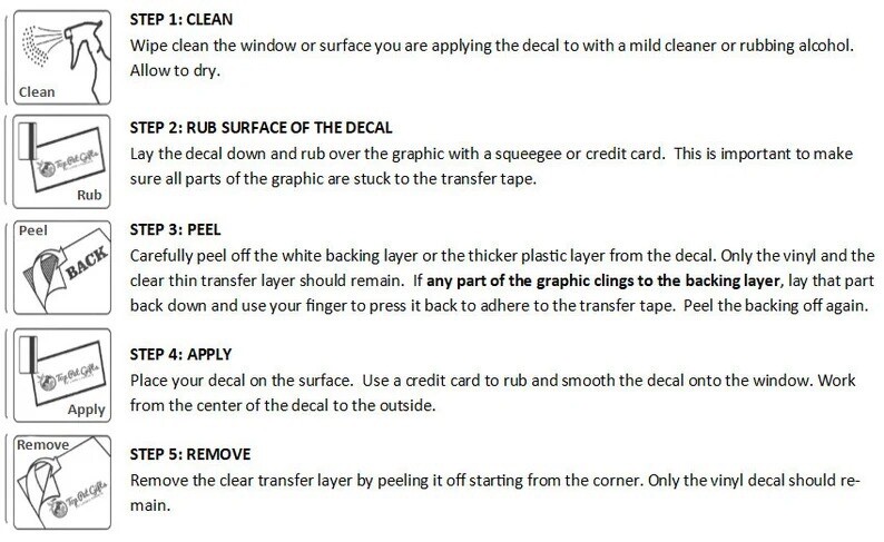 : Color: YOU CHOOSE : Size: YOU CHOOSE : Can be applied to your vehicle windows, or any smooth surface. : Material and product MADE IN USA : Stickers have no background at all, just the color lettering you choose. : Self adhesive backing designed to last 9 years outdoors and unlimited indoor exposure : Easy to install, just peel the backing paper and stick. : Not those cheap stickers my competitors are selling. Our sticker material is manufactured and precision die cut here in the USA and specifically made for cars, trucks, Suv's Vans, Mini vans, bikes, motorcycles or any smooth surface. About your shipment: All orders will be shipped out withing 24 hours of the time of purchase, excluding weekends and holidays. About our return policy: We have a 30 day hassle free return policy. So if you are not happy with our stickers you can go ahead and ship it back to us, as long as the sticker is NOT used and its in the same condition it was shipped to you. Buyer pays return shipping costs About Feedback: Please leave us positive feedback rating us on our shipping, customer service, handling time, and quality of our decals. We would really appreciate it and we would do the same for you. If you encountered a problem with your order please feel free to contact us before leaving the feedback. We will NOT ignore you like other sellers!! APPLICATION INSTRUCTIONS: 1. Rub the sticker to be sure the transfer tape is properly adhered to the sticker. 2. Clean and dry the desired area. Stickers will stick best to clean, smooth surfaces. 3. Slowly remove the paper backing making sure that the sticker stays adhered to the clear transfer tape. 4. Carefully position the decal in the desired area. Once placed it can not be moved so be very careful during this process. 5. Rub the sticker from one side to the other eliminating any air bubbles. 6. Use a hard edged object such as a squeegee or credit card to to rub the decal onto the surface to which you applied it to. 7. Slowly peel the clear transfer tape off making sure no part of the vinyl decal remains on the transfer tape. Check for air bubbles. In most cases, air bubbles can be worked to the edge of the sticker. If not, pin a hole and squeegee the air out. Once done the hole will become virtually invisible once the air bubble is gone. That's it. You finished applying your sticker.