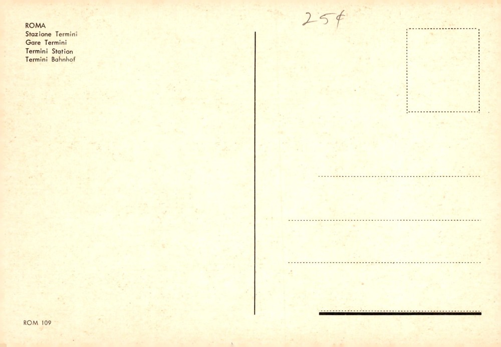 Postcard featuring Stazione Termini, the main railway station in Rome, Italy. The station, also known as Gare Termini, serves as a major transportation hub.