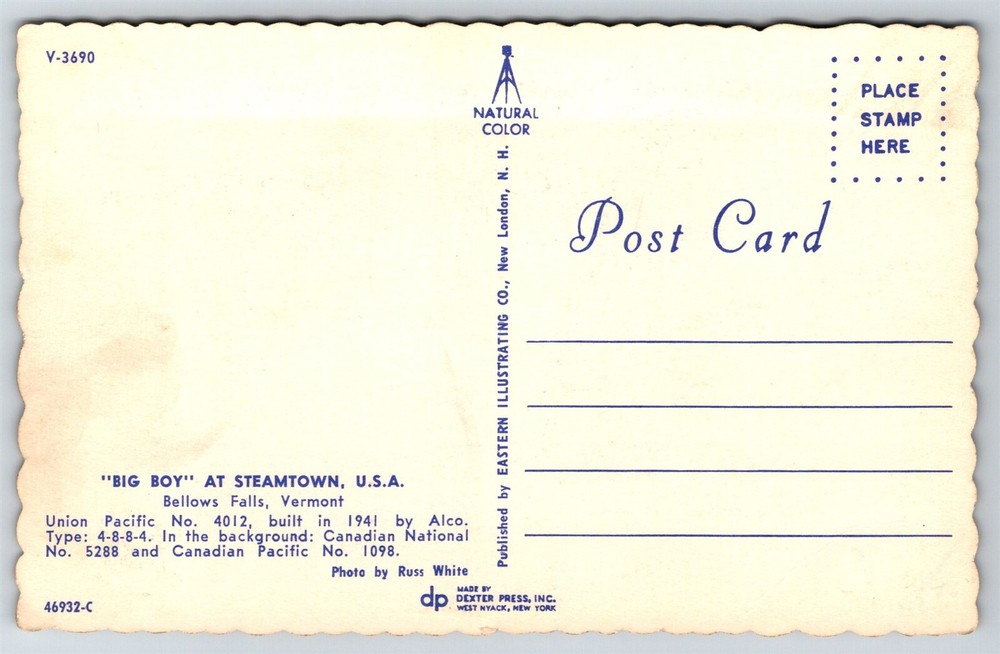 Steamtown USA Union Pacific No 4012 Big Boy Bellows Falls VT Postcard D24 Thank you for visiting! This is a standard size postcard, 3.5" X 5.5". In stock, usually ships within 24 hours of your purchase. Please ask questions if you are unsure about anything. Our goal is for your complete satisfaction with the postcard and your experience. Check all my other listings in my store. RETIREDWITHBOOKS Powered by SixBit's eCommerce Solution