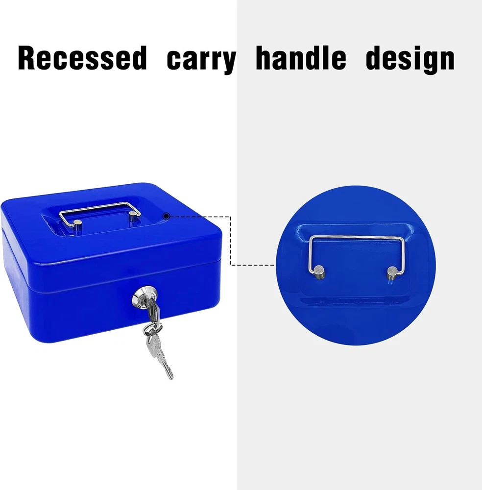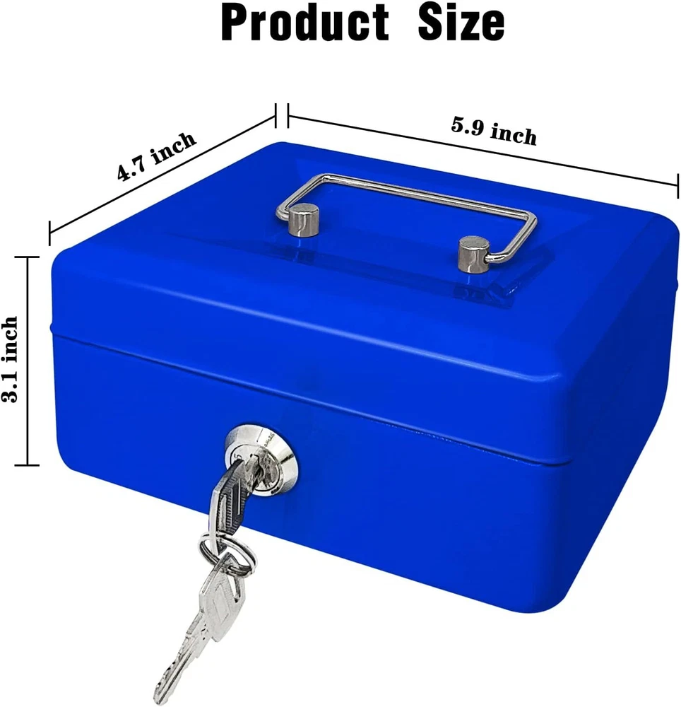 Steel Cash Box with Key Lock, Metal Small Money Blue - 5.9" X 3.1" X 4.7" Product Details Manufacturer: PACOLO Part Number: Steel Cash Box with Key Lock Item Weight: 1.08 pounds Product Dimensions: 5.9 x 3.1 x 4.7 inches Country of Origin: China Item model number: Steel Cash Box with Key Lock Color: Blue - 5.9" X 3.1" X 4.7" Style: Classic Material: Alloy Steel, Metal Item Package Quantity: 1 Mounting Type: Floor Mount Special Features: Key Lock Included Components: Stainless Steel, Alloy Steel, Plastic, Metal Batteries Included?: No Batteries Required?: No Size and Color: Exterior dimensions: 4.9 inch x 3.74 inch x 2.16 inch; Four colors(Black, White, Red, and Blue) are available for you to choose from. Key Lock: This cash box has a key lock to keep valuables safe. The key is easy to operate and can be opened with one hand. Removable Tray: This cash box has a removable tray with six compartments for excellent coin organization and a layer underneath the tray for storing cash and checks. Highly Quality: This solid steel cash box does not fear knocks and shocks.Suitable for storing bills, coins, checks, and receipts. The lock box is lightweight with a convenient handle, so you can take it anywhere and hide it easily. Wide Application: This money box with a key is suitable for indoor or outdoor small businesses, commercial supermarkets, stores, lockers, cabinets, and family use. It is also a perfect gift for your friends and family for birthdays, Mother’s Day, or Christmas. Suitable for storing bills, coins, checks, and receipts.