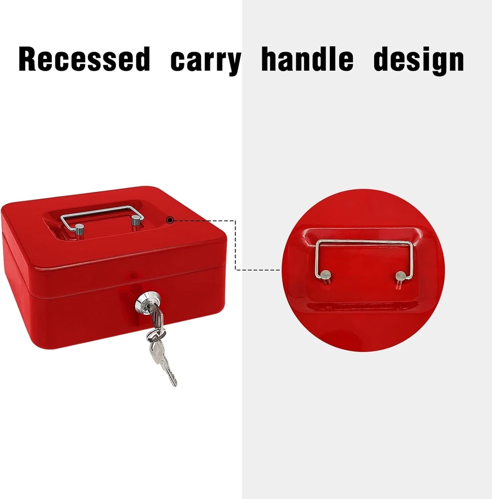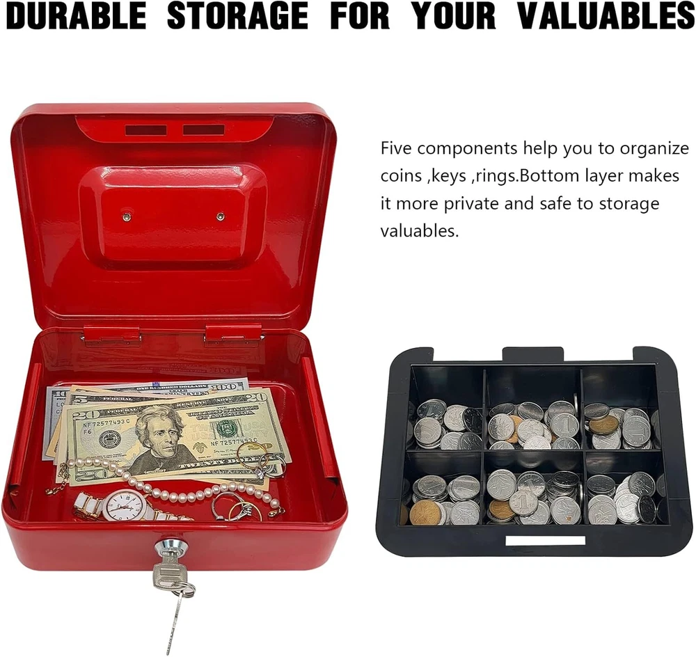 Steel Cash Box with Key Lock, Metal Small Money Organizer Red - 8 inch Product Details Brand: PACOLO Product Dimensions: 5.9"D x 3.1"W x 4.7"H Lock Type: Key Color: Red - 8 inch Material: Alloy Steel, Metal Special Feature: Key Lock Mounting Type: Floor Mount Control Type: Key Control Included Components: Stainless Steel, Alloy Steel, Plastic, Metal Water Resistance Level: Not Water Resistant Chamber Depth: 5.9 Inches Manufacturer: PACOLO Part Number: Steel Cash Box with Key Lock Item Weight: 1.74 pounds Country of Origin: China Item model number: Steel Cash Box Special Features: Key Lock Batteries Included?: No Batteries Required?: No Brand: PACOLO Product Dimensions: 5.9"D x 3.1"W x 4.7"H Lock Type: Key Color: Red - 8 inch Material: Alloy Steel, Metal Special Feature: Key Lock Mounting Type: Floor Mount Control Type: Key Control Included Components: Stainless Steel, Alloy Steel, Plastic, Metal Water Resistance Level: Not Water Resistant Size and Color: Exterior dimensions: 7.8 inch x 6.3 inch x 3.3 inch; Four colors(Black, White, Red, and Blue) are available for you to choose from. Key Lock: This cash box has a key lock to keep valuables safe. The key is easy to operate and can be opened with one hand. Removable Tray: This cash box has a removable tray with six compartments for excellent coin organization and a layer underneath the tray for storing cash and checks. Highly Quality: This solid steel cash box does not fear knocks and shocks.Suitable for storing bills, coins, checks, and receipts. The lock box is lightweight with a convenient handle, so you can take it anywhere and hide it easily. Wide Application: This money box with a key is suitable for indoor or outdoor small businesses, commercial supermarkets, stores, lockers, cabinets, and family use. It is also a perfect gift for your friends and family for birthdays, Mother’s Day, or Christmas. Suitable for storing bills, coins, checks, and receipts.