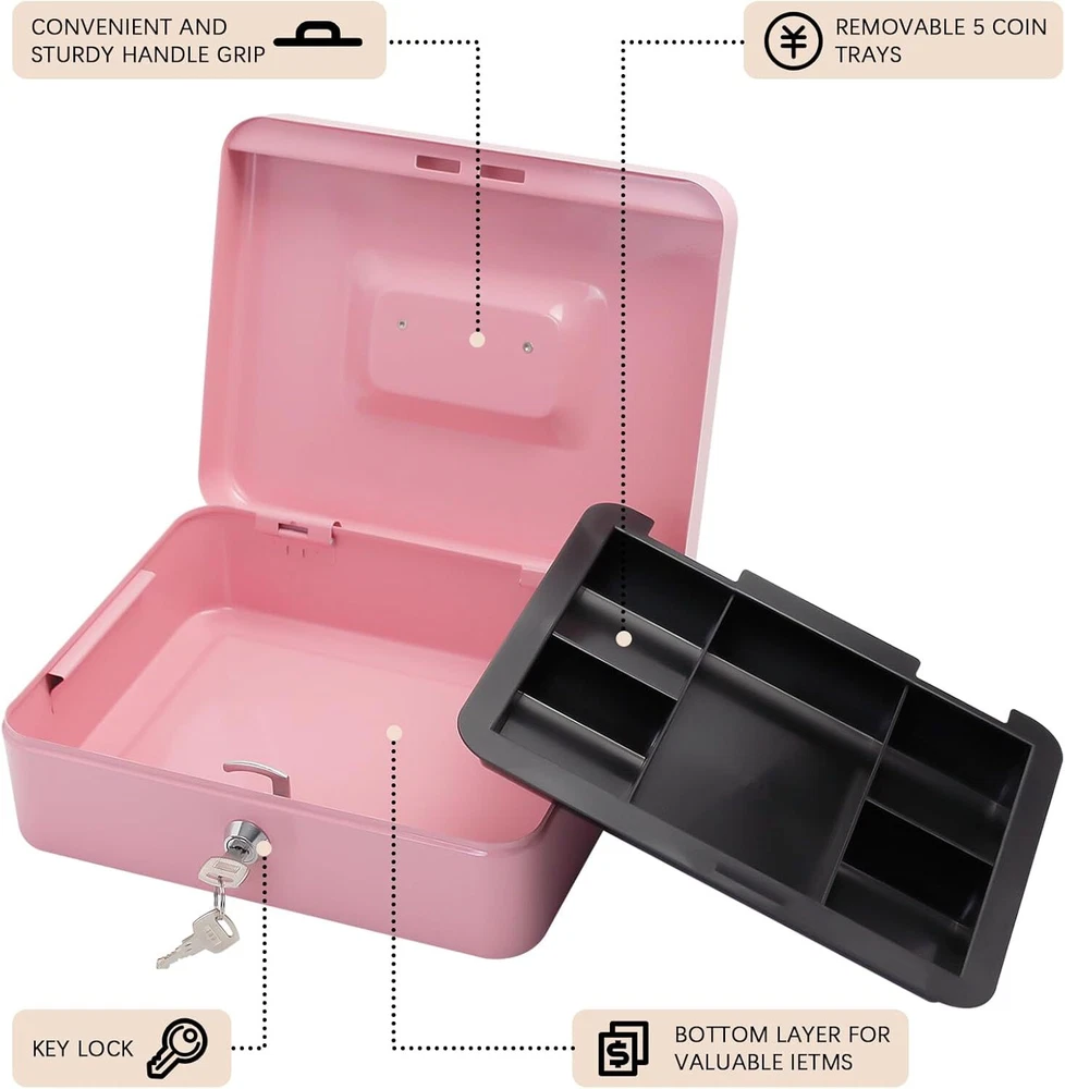 Steel Cash Box with Key Lock, Metal Small Money Pink - 9.8" x 7.8" x 3.3"
