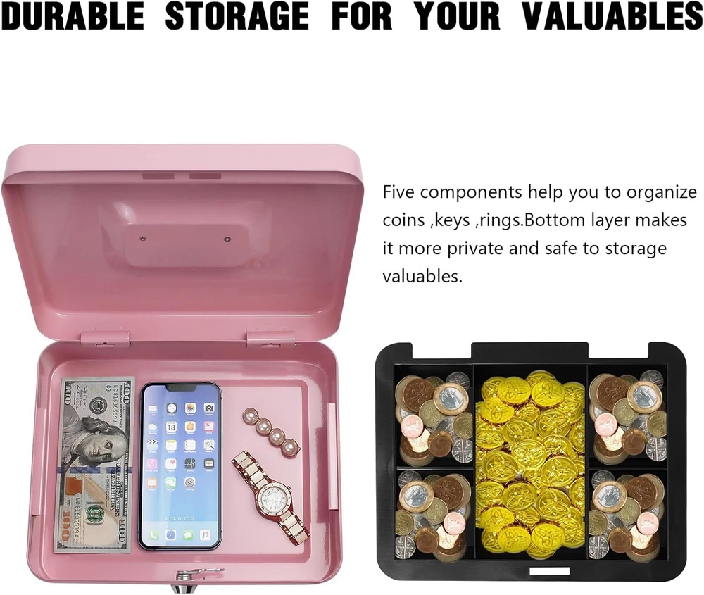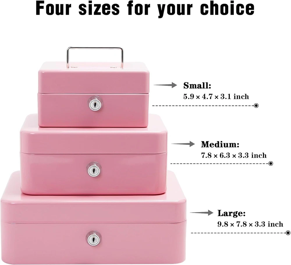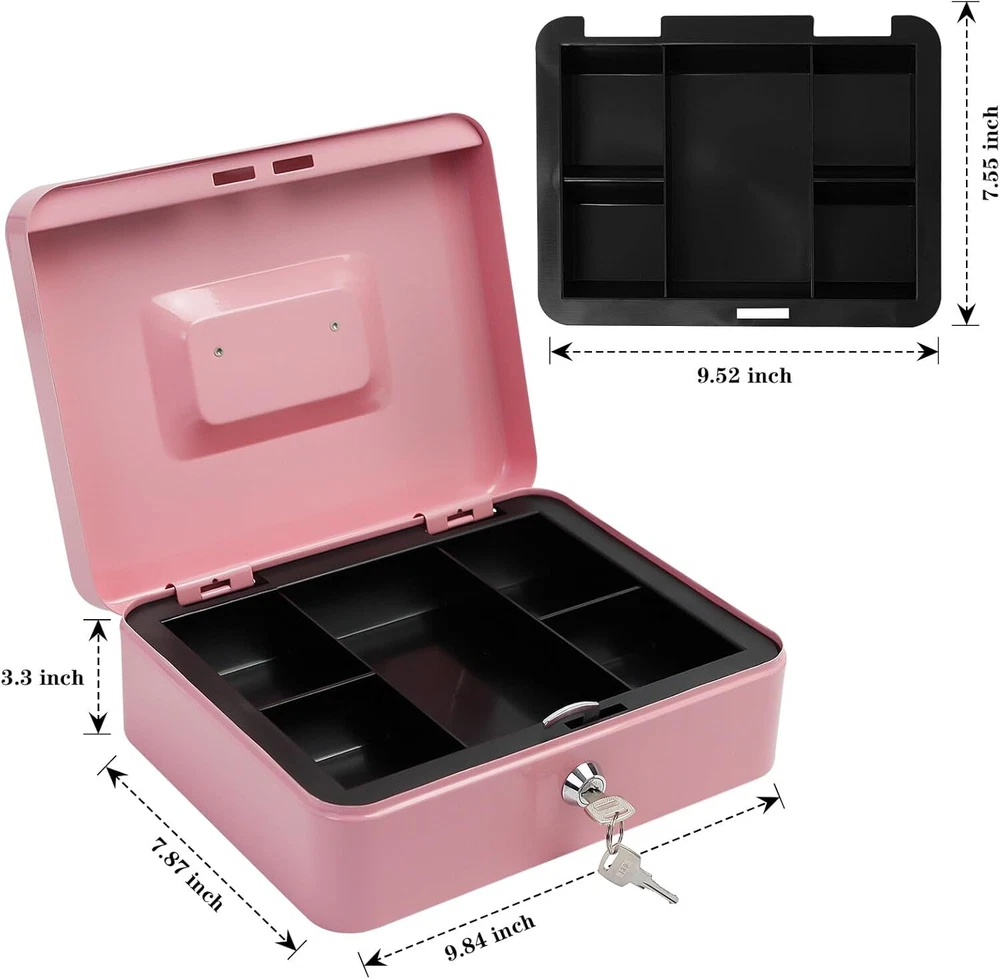 Steel Cash Box with Key Lock, Metal Small Money Pink - 9.8" x 7.8" x 3.3" Product Details Brand: PACOLO Product Dimensions: 5.9"D x 3.1"W x 4.7"H Lock Type: Key Color: Pink - 9.8" x 7.8" x 3.3" Special Feature: Key Lock Mounting Type: Floor Mount Control Type: Key Control Included Components: Stainless Steel, Alloy Steel, Plastic, Metal Water Resistance Level: Not Water Resistant Chamber Depth: 5.9 Inches Manufacturer: PACOLO Item Weight: 2.55 pounds Country of Origin: China Item model number: Steel Cash Box with Key Lock Special Features: Key Lock Batteries Included?: No Batteries Required?: No Brand: PACOLO Product Dimensions: 5.9"D x 3.1"W x 4.7"H Lock Type: Key Color: Pink - 9.8" x 7.8" x 3.3" Special Feature: Key Lock Mounting Type: Floor Mount Control Type: Key Control Included Components: Stainless Steel, Alloy Steel, Plastic, Metal Water Resistance Level: Not Water Resistant Chamber Depth: 5.9 Inches Size And Color:Exterior dimensions: 4.9 inch x 3.74 inch x 2.16 inch,4 colors(Black, White,Pink and Blue) available for you to choose. Key Lock:This cash box has a key lock to keep valuables safe. The key is easy to operate,can open it no problem with one hand. Removable Tray:This cash box has a removable tray with 6 compartments which makes for great coin organization,as well as a layer underneath the tray for storing cash and checks. Highly Quality:This cash boxes is made of high quality steel which is solid and not afraid of knocks and shocks.Suitable to store bills, coins, checks and receipts.The lock box is lightweight with a convenient handle, so you can take it to anywhere and hide it easily. Wide Application:This money box with key is suitable for indoor or outdoor small business,commercial supermarket,store,lockers, cabinets, family use.It also is a perfect gift for Birthday, Mother’s day,Christmas for your friends and family. Suitable to store bills, coins, checks and receipts.
