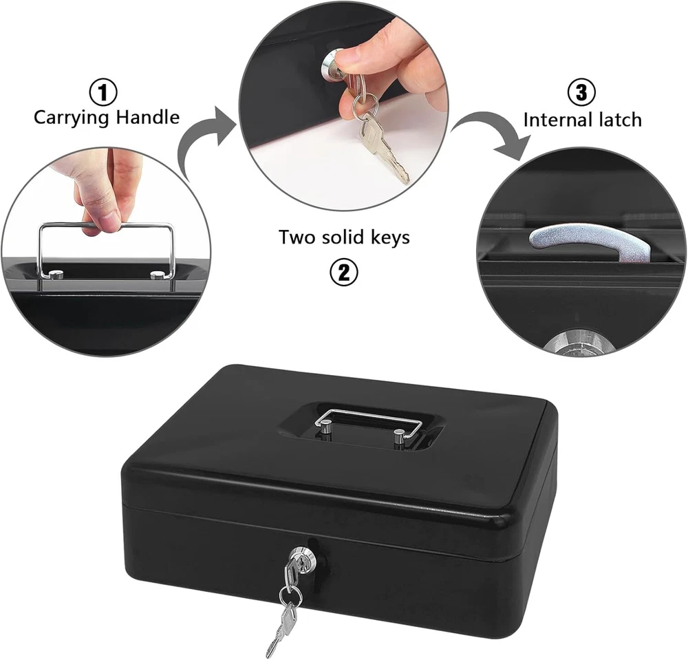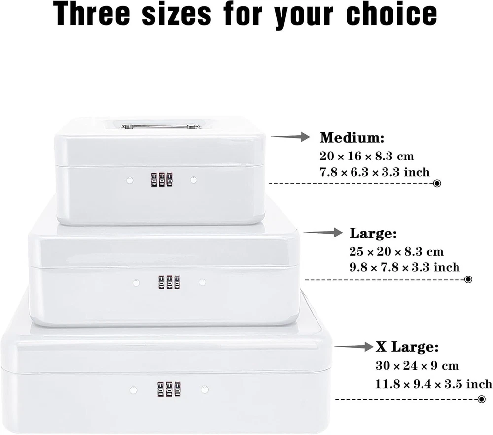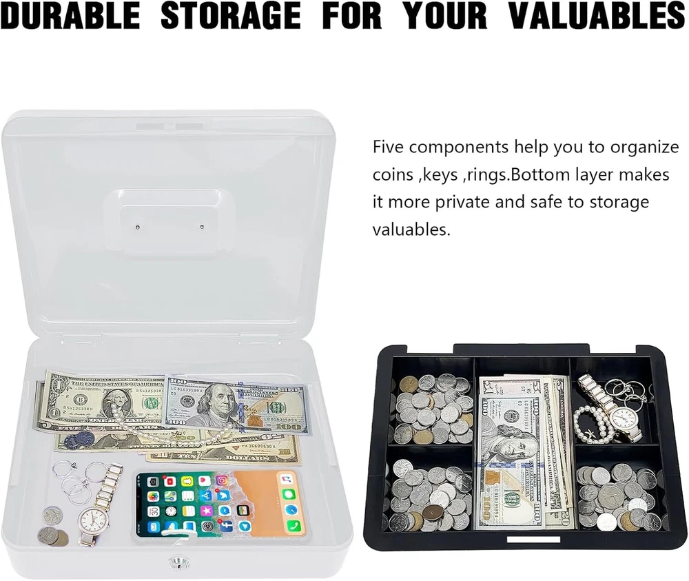 Steel Cash Box with Key Lock, Metal Small Money White- 11.8" x 9.4" x 3.5" Product Details Brand: PACOLO Product Dimensions: 5.9"D x 3.1"W x 4.7"H Lock Type: Key Color: White- 11.8" x 9.4" x 3.5" Material: Alloy Steel, Metal Special Feature: Key Lock Mounting Type: Floor Mount Control Type: Key Control Included Components: Stainless Steel, Alloy Steel, Plastic, Metal Water Resistance Level: Not Water Resistant Chamber Depth: 5.9 Inches Manufacturer: PACOLO Item Weight: 3.3 pounds Country of Origin: China Item model number: Steel Cash Box Special Features: Key Lock Batteries Included?: No Batteries Required?: No Brand: PACOLO Product Dimensions: 5.9"D x 3.1"W x 4.7"H Lock Type: Key Color: White- 11.8" x 9.4" x 3.5" Material: Alloy Steel, Metal Special Feature: Key Lock Mounting Type: Floor Mount Control Type: Key Control Included Components: Stainless Steel, Alloy Steel, Plastic, Metal Water Resistance Level: Not Water Resistant Size And Color:Exterior dimensions: 11.8 inch x 9.4 inch x 3.5 inch,4 colors(Black, White,Pink and Blue) available for you to choose. Key Lock:This cash box has a key lock to keep valuables safe. The key is easy to operate,can open it no problem with one hand. Removable Tray:This cash box has a removable tray with 6 compartments which makes for great coin organization,as well as a layer underneath the tray for storing cash and checks. Highly Quality:This cash boxes is made of high quality steel which is solid and not afraid of knocks and shocks.Suitable to store bills, coins, checks and receipts.The lock box is lightweight with a convenient handle, so you can take it to anywhere and hide it easily. Wide Application:This money box with key is suitable for indoor or outdoor small business,commercial supermarket,store,lockers, cabinets, family use.It also is a perfect gift for Birthday, Mother’s day,Christmas for your friends and family. Suitable to store bills, coins, checks and receipts.