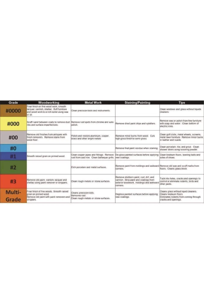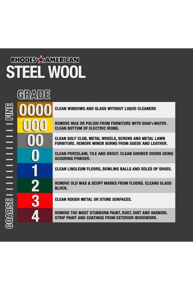 Homax 10120000 Steel Wool, 12 pad, Grade #0000, Rhodes American, Final Finish Product Description: Steel wool super fine grade #0000 used in cleaning, polishing, buffing and refinishing Uniform, high quality metal strands with gentle abrasiveness Each bag has 16 steel wool pads Flexible to reach in and around corners Use to smooth wood, lacquer, varnish, shellac and polyurethane; remove finish and buff furniture; clean precision tools; DE gloss painted surfaces Use steel wool instead of sandpaper for extra fine wood working projects. Use steel wool to clean and polish chrome when combined with the right products. Steel wool can be used to keep certain pests out by inserting it into holes. Use Homax Steel Wool to when cleaning and refinishing retro wooden furniture. Product Details: Material: Wool Grit Material: Steel Wool Item dimensions L x W x H: 18.6 x 8.8 x 8.5 inches Grit Type: Fine,Super,Super Fine