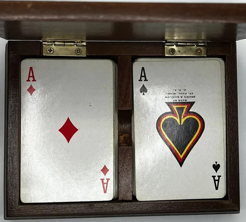 This vintage advertising item from Steere Tank Lines features a double deck pair of playing cards, stored in a beautiful wood case. The cards are a piece of American history, manufactured in the United States in the 1960s. They make a great addition to any collection of transportation memorabilia. The cards are in used condition, but have been well preserved in their protective case. They showcase the iconic Steere Tank Lines logo and are sure to be a conversation starter. Don't miss the chance to own a piece of advertising-print history with this unique and timeless item. RARE! 2 pack, double deck set of gently used, complete decks. In a wood case. See pics for better detail and measurements. Case has some signs of wear, cards are in excellent shape.