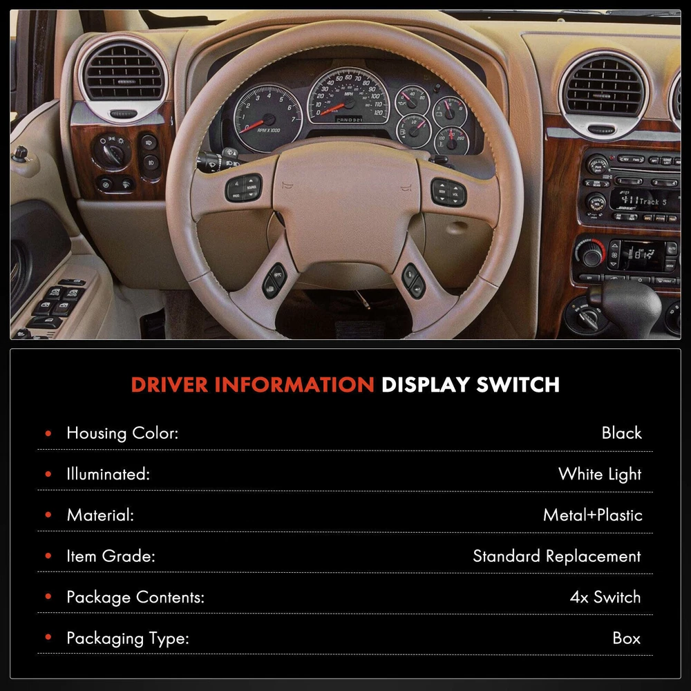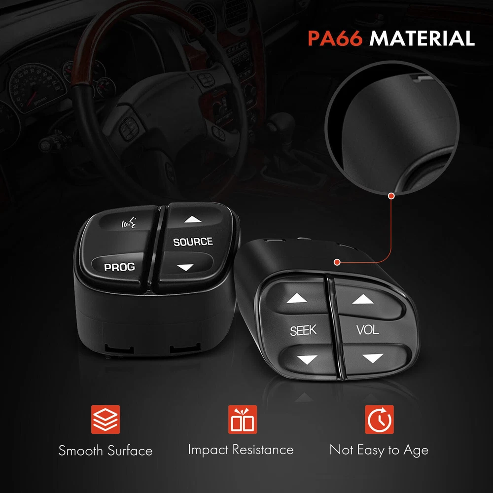 Steering 4Pcs Switch Wheel Buttons Control for Chevy Silverado 1500 GMC Sierra Item Type: Steering Wheel Control Switch Condition: Brand New Warranty: Five Year Warranty Quantity Sold: A Set of Four Pieces Kit Parts Included: 1x Seek and Volume Button ( Right Side of Steering Wheel Radio Control ) Part Number# 1999443, 901-123 1x Program and Source Button ( Left Side of Steering Wheel Radio Control) Part Number# 1999442, 901-122 1x Select and Personalization Button ( Right Side of Steering Wheel) Part Number# 12450244, 21997739, 901-121 1x Trip and Fuel Button ( Left Side of Steering Wheel ) Part Number# 12450243, 21997738, 901-120 ▷ Vehicle Information: Buick 2003-2007 Buick Rainier ·Steering Wheel ·White Light Cadillac 2003-2007 Cadillac Escalade ·Steering Wheel ·White Light 2003-2007 Cadillac Escalade ESV ·Steering Wheel ·White Light 2003-2007 Cadillac Escalade EXT ·Steering Wheel ·White Light Chevrolet 2007 - 2007 Chevrolet Avalanche ·Steering Wheel ·White Light 2003-2006 Chevrolet Avalanche 1500 ·Steering Wheel ·White Light 2003-2006 Chevrolet Avalanche 2500 ·Steering Wheel ·White Light 2003-2007 Chevrolet Silverado 1500 ·Steering Wheel ·White Light 2005-2007 Chevrolet Silverado 1500 Classic ·Steering Wheel ·White Light 2003 - 2003 Chevrolet Silverado 1500 HD ·Steering Wheel ·White Light 2007 - 2007 Chevrolet Silverado 1500 HD Classic ·Steering Wheel ·White Light 2003-2004 Chevrolet Silverado 2500 ·Steering Wheel ·White Light 2003-2007 Chevrolet Silverado 2500 HD ·Steering Wheel ·White Light 2007 - 2007 Chevrolet Silverado 2500 HD Classic ·Steering Wheel ·White Light 2003-2006 Chevrolet Silverado 3500 ·Steering Wheel ·White Light 2007 - 2007 Chevrolet Silverado 3500 Classic ·Steering Wheel ·White Light 2007 - 2007 Chevrolet Silverado 3500 HD ·Steering Wheel ·White Light 2003-2007 Chevrolet Suburban 1500 ·Steering Wheel ·White Light 2003-2007 Chevrolet Suburban 2500 ·Steering Wheel ·White Light 2003-2007 Chevrolet Tahoe ·Steering Wheel ·White Light 2004-2009 Chevrolet Trailblazer ·Steering Wheel ·White Light 2004-2006 Chevrolet Trailblazer EXT ·Steering Wheel ·White Light GMC 2004-2009 GMC Envoy ·Steering Wheel ·White Light 2004-2006 GMC Envoy XL ·Steering Wheel ·White Light 2004-2005 GMC Envoy XUV ·Steering Wheel ·White Light 2003-2007 GMC Sierra 1500 ·Steering Wheel ·White Light 2007 - 2007 GMC Sierra 1500 Classic ·Steering Wheel ·White Light 2003-2006 GMC Sierra 1500 HD ·Steering Wheel ·White Light 2007 - 2007 GMC Sierra 1500 HD Classic ·Steering Wheel ·White Light 2003-2004 GMC Sierra 2500 ·Steering Wheel ·White Light 2003-2007 GMC Sierra 2500 HD ·Steering Wheel ·White Light 2007 - 2007 GMC Sierra 2500 HD Classic ·Steering Wheel ·White Light 2003-2006 GMC Sierra 3500 ·Steering Wheel ·White Light 2007 - 2007 GMC Sierra 3500 Classic ·Steering Wheel ·White Light 2007 - 2007 GMC Sierra 3500 HD ·Steering Wheel ·White Light 2003-2007 GMC Yukon ·Steering Wheel ·White Light 2003-2007 GMC Yukon XL 1500 ·Steering Wheel ·White Light 2003-2007 GMC Yukon XL 2500 ·Steering Wheel ·White Light Hummer 2003-2007 Hummer H2 ·Steering Wheel ·White Light Oldsmobile 2004 - 2004 Oldsmobile Bravada ·Steering Wheel ·White Light Isuzu 2005-2008 Isuzu Ascender ·Steering Wheel ·White Light 1. We only accept PayPal payment , should be received within 3 days from the date of purchase. 2. Please keep the consistency of Paypal address and ebay address. 3. Payment should be made within 3 days once you won a item ,or ebay will launch Unpaid Reminder agaist you and there will be bad record on your ebay account . (1) Item will be shipped from US post on the 72 hours . (2) We ship this item to UK only via USPS or UPS . It usually takes 3-6 business days to deliver. 1. If you like our products, please add my eBay shop to your "My Favorites" list. 2. Your satisfaction and positive feedback are very important to us. Please leave positive feedback with 5 stars if you are satisfied with our items and services. Our office hours are Monday- Friday 9:00AM - 6:00PM PST, but we will response you once we get your message .There will be some delay on respons if you send message or E-Mail on Saturday and Sunday.