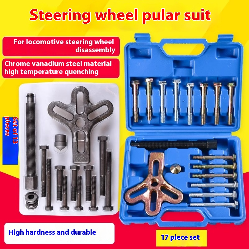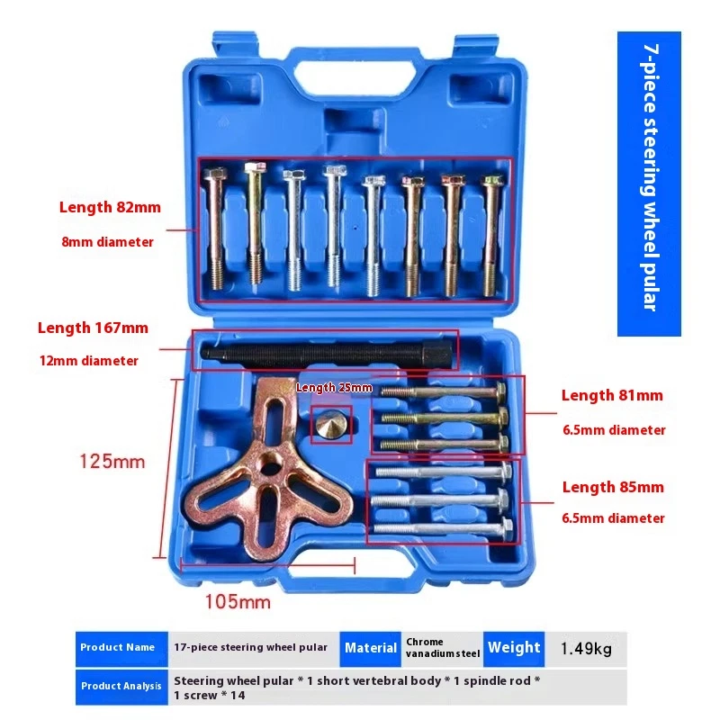 Steering Wheel Pull Code Remover Steering Wheel Puller Repair Auto Tools Product Name:17pcs steering wheel puller set Material: chrome vanadium steel Weight: 1.49kg Product Analysis: Steering wheel puller * 1 short vertebra * 1 spindle rod * 1 screw * 14