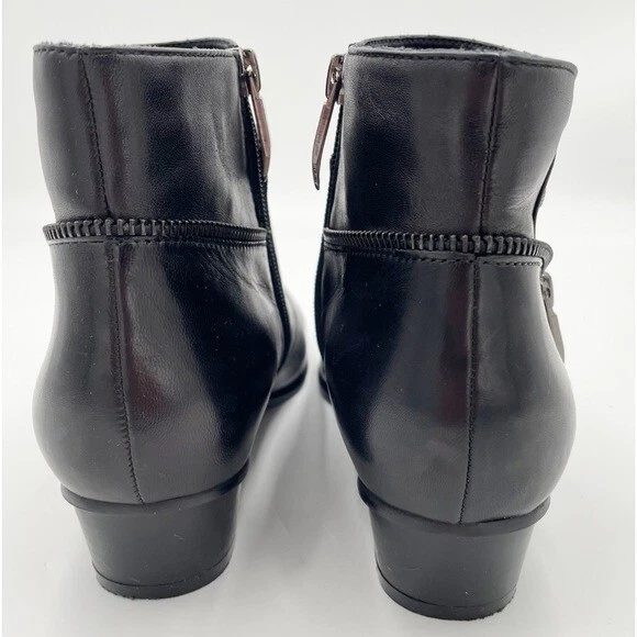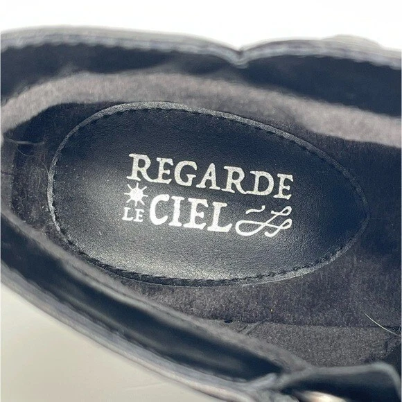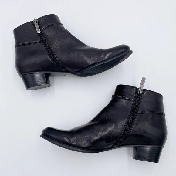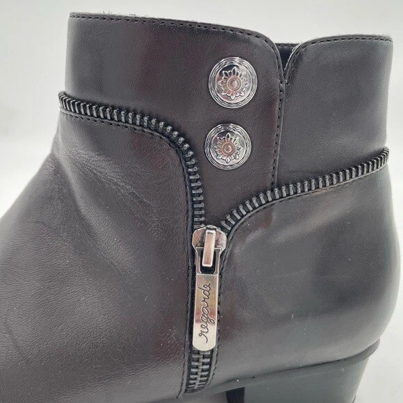 Regarde Le Ciel Stefany 277 Boot Black leather ankles boots with decorative zipper and stud details Inner zipper closure Small block heel measures approximately 1.5" high Size 39 Very good pre-owned condition Small area of discoloration on leather - see last photo for close up