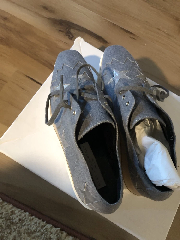 Elevate your style with these stunning size 41 Stella McCartney Light Blue Denim Fabric Elyse Stars Platform Lace Up sneakers. The almond toe shape and lace-up closure provide a comfortable fit, while the 3-inch platform height and high 3-3.9 inch heel height add a touch of glamour. The rubber outsole and standard shoe width ensure durability and comfort. These stylish sneakers are perfect for any occasion, from a casual day out to a night on the town. The stars theme adds a fun and unique touch to the design, making these shoes a must-have for any fashion-forward woman.