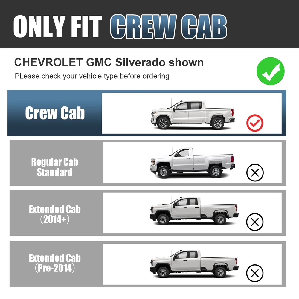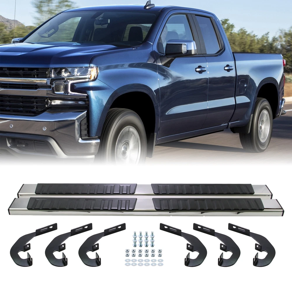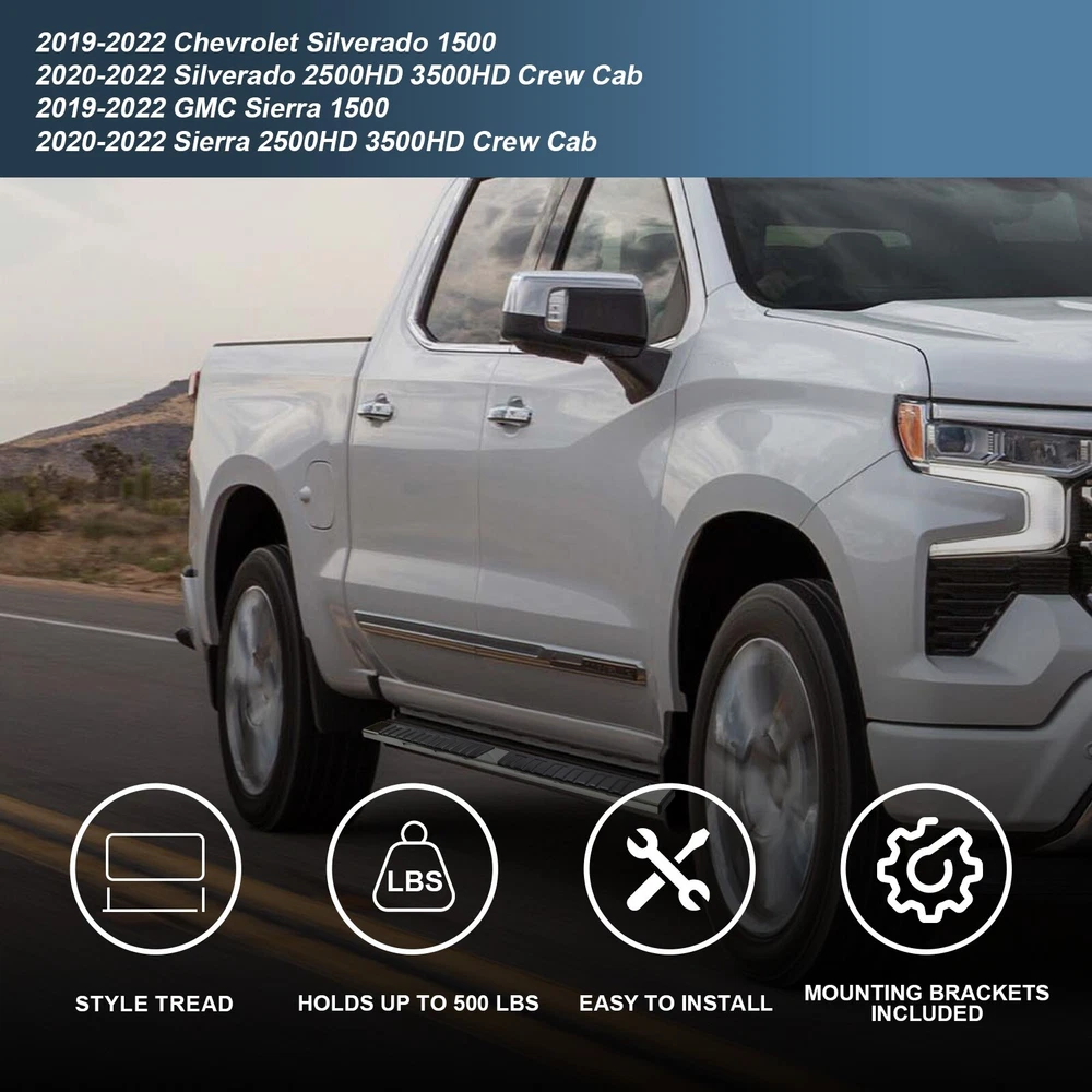 Specification Material: Stainless Steel, ABS Only Fit: Crew Cab Item Weight(lbs): 48.06 Package Dimensions(LengthxWidthxHeight:inch): 85.43x8.66x8.66 Package Weight(lbs): 50.27 Condition: New Style: OE Style Installation Instruction: Not Included Placement on Vehicle: Left+Right Vehicle Service Type: Truck Fitment Type: Direct Replacement Color: Black, Silver Package Include: 1x Pair of Running Boards (Left + Right) Brackets on Each Side Mounting Hardware Sealing End Cover: Yes Manufacturer Warranty: 1 Year Tread(inch):6" Fitment 2019- 2023 Chevrolet Silverado 1500 2022- 2023 Chevrolet Silverado 1500 LTD 2020- 2023 Chevrolet Silverado 2500 HD 2020- 2023 Chevrolet Silverado 3500 HD 2019-2023 GMC Sierra 1500 2022- 2023 GMC Sierra 1500 Limited 2020-2023 GMC Sierra 2500 HD 2020-2023 GMC Sierra 3500 HD Description 1. Made with durable, heavy-duty high light stainless steel and ABS plastic. Seamless joined ABS plastic tread with powder coated body surface to achieve great UV rays, rust, and slippery resistance. 2. Our running boards are made from the finest aluminum alloy, which is sturdy, durable, wear-resistant and rust-resistant. After repeated tests, they can resist the corrosion of salt spray, and withstand UV radiation without discoloration. 3. To a certain extent, they also help protect the paint on the side of the car from being scratched. At the same time, you can easily reach the top of your car when you need it, such as accessing the luggage rack or cleaning the rooftop. 4. Slider Design, Able to adjust position on vehicle forward & backwards for better customization. the whole closed end design make your running board inside clean. 5. Whatever finish you choose, the result is a smooth, finished look that complements your factory chrome and trim perfectly. 6. Running Boards & Side Steps make your life safe and simple for taking your coworkers to the job place, take your pets go out or carpooling the kids to school both. You have a very solid under foot feeling thanks to the Anti-slip tread surface and rugged construction. 7. Easy bolt-on installation: No cutting or drilling. On Nov 18, 2024 at 03:01:10 PST, seller added the following information: On Nov 22, 2024 at 01:59:20 PST, seller added the following information: