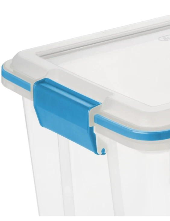 Sterilite 20 Qt. Clear Gasket Storage Box, Blue Latches with Clear Lid. About this item : Overall Assembled Size: 16 1/8" x 11 1/4" x 10 7/8" Ideal solution for those items that need to be stored away and protected Gasketed seal safeguards items from air and moisture, dust and pests Durable, tight-fitting latches keep the lid secured to the base Clear base and lid allow for easy identification of contents, without having to open it. Product details : Sterilite' s Gasket Box line is the ideal storage solution for keepsakes, photographs, important documents, linens, and other items that need to be stored away and protected. Gasket Boxes offer a gasketed seal to safeguard items from both air and moisture, keeping those special belongings safe from the elements, dust and pests. Durable, tight-fitting latches keep the lid secured to the base, and the clear lid and base allow contents to be easily identified, without opening the lid. The 20 Quart size is ideal for organizing school projects, paperwork and photographs that need to be protected, and fits conveniently on 16" wire closet shelving, making it ideal for organizing and storing small items in the closet. The gasketed seal also helps to keep pet food and other bulk foods fresh longer. The Gasket Box line has eight sizes, ranging from 7.5 Qt to 120 Qt, providing a variety of storage options for those items that need to be kept safe as well as for longer term storage needs. The 12 Qt and 20 Qt Gasket Boxes use the same lid, allowing both the shallow and deep sizes to be stacked in same footprint.
