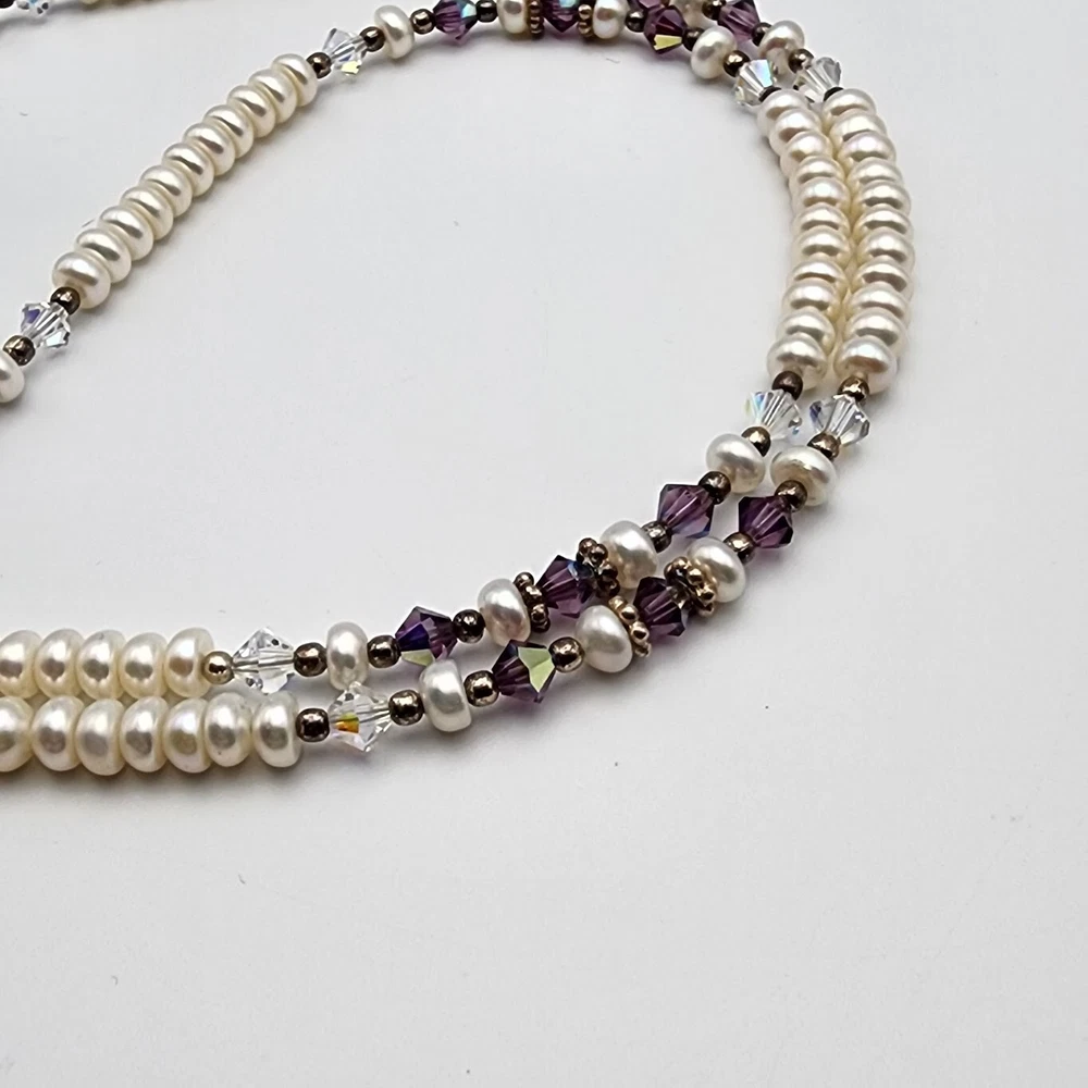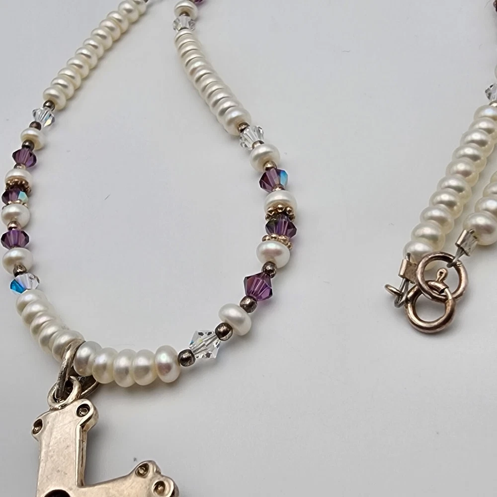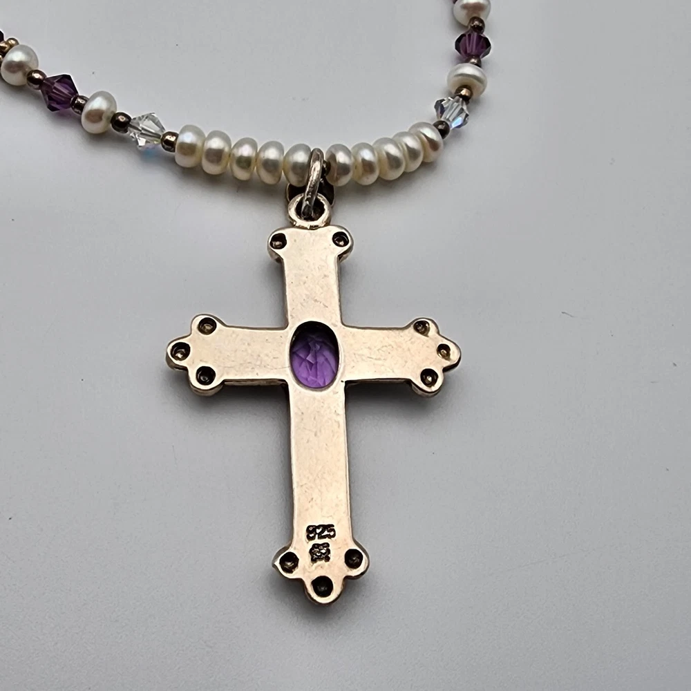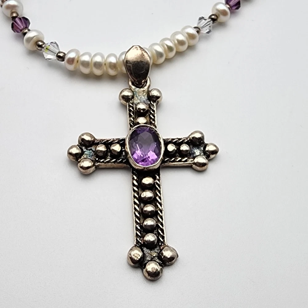 Sterling Cross Bezel Set Amethyst Pendant Button Pearl Crystal Necklace Handmade This Is A Signed Piece. I Cannot Identify the Maker. Beautiful Piece. Beads Are 4mm