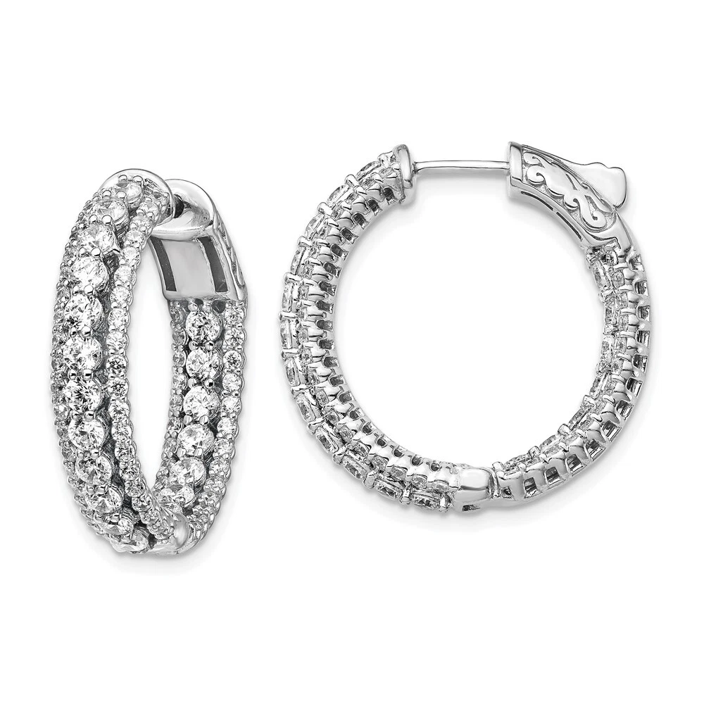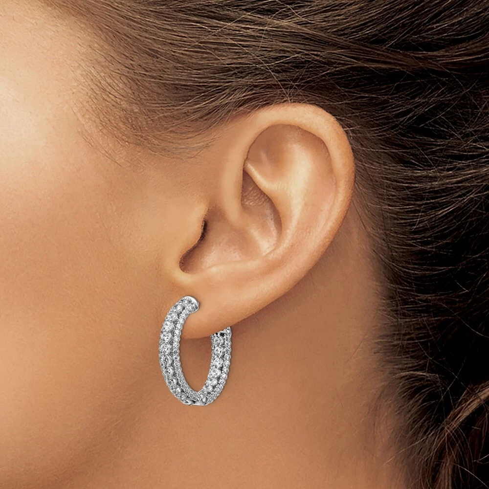 Features: Material Purity:925 Finish:Polished Stone Type_1:Cubic Zirconia (CZ) Stone Type_2:Cubic Zirconia (CZ) Stone Color_1:Clear Stone Color_2:Clear Stone Quantity_1:132 Stone Quantity_2:38 Length of Item:0.75 in Plating:Rhodium Stone Setting_1:Shared Prong Stone Setting_2:Shared Prong Feature:Solid Manufacturing Process:Casted Material: Primary:Sterling Silver Completeness:Complete (all stones included) Stone Shape_1:Round Stone Shape_2:Round Stone Size_1:1.2 mm Stone Size_2:2.3 mm Stone Treatment_1:Synthetic Stone Treatment_2:Synthetic Thickness:3.33 mm Width of Item:5.28 mm Jewelry Type:Earrings Sold By Unit:Pair Gender:Women's Material Color:White Earring Closure:Post, Notch & Lock Earring Type:In & Out Hoop Plating Color:Silver Tone Stone Creation Method_1:Synthetic Stone Creation Method_2:Synthetic All weights and measurements are approximate and may vary slightly from the listed information. Welcome to diamond_6720 Payments We accept all Ebay approved payment. Please sent the payment to us within 8 days after the auction has ended, or you will have unpaid case auto open by eBay. Shipping Policy We will ship all items within 1 business days of purchase during the work week (M-F) excluding holidays. If you order on Friday, your order will be shipped the following business day. Tracking will be provided when it becomes available. We will only ship to a PayPal Verified Address. Please make sure your address is current and correct. If the information does not match, your order may be canceled. Buyers are responsible for all customs, duties and taxes for your respective countries. Delivery times for International Shipping will vary. California Buyers Pay 9.0% Tax on all orders. case auto open by eBay. Return Policy & Exchange Returns or Exchange are accepted. Buyer must contact us within 30 days after the item is received. Item must be returned in unworn and resalable condition. We will only issue a refund for the purchase price, excluding any shipping fees. If we are at fault, we will provide a full refund. Buyer is responsible for all return shipping costs. BUYERS FEEDBACK If you have any concerns regarding your purchase, please contact us via eBay Message, we assure you that a satisfactory resolution will be reached. Your feedback is very important to us Do remember to give us 5 star rating(*****) if you are satisfied with our product & service .