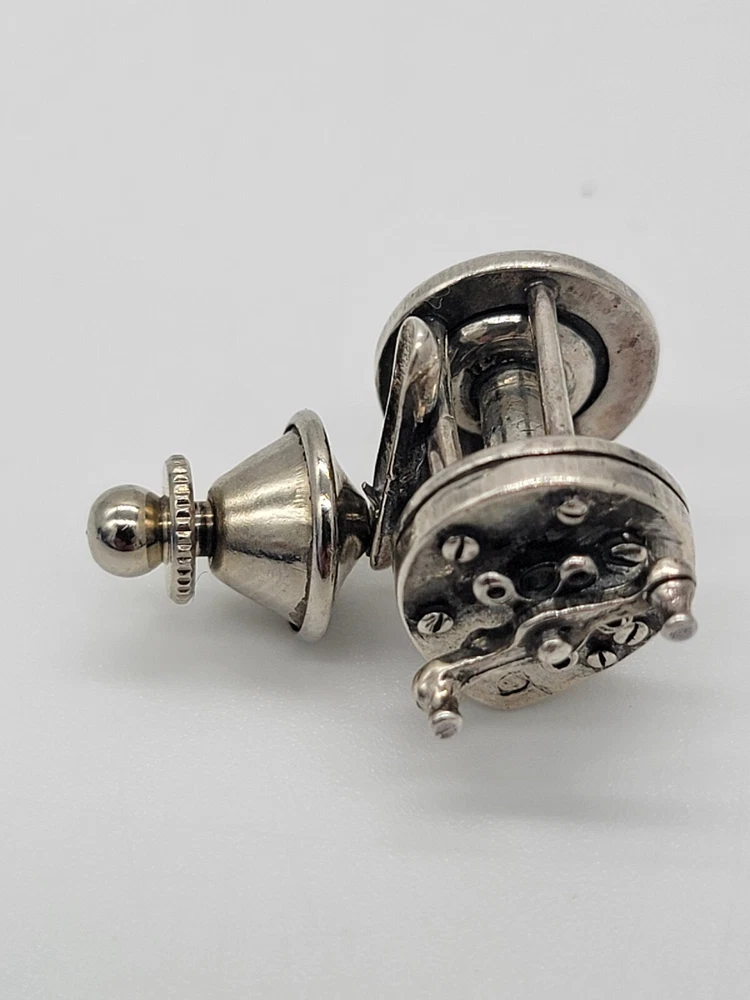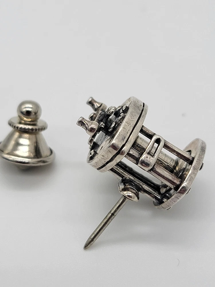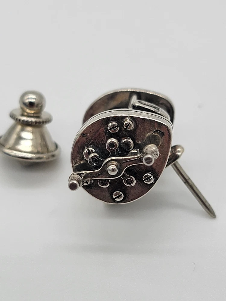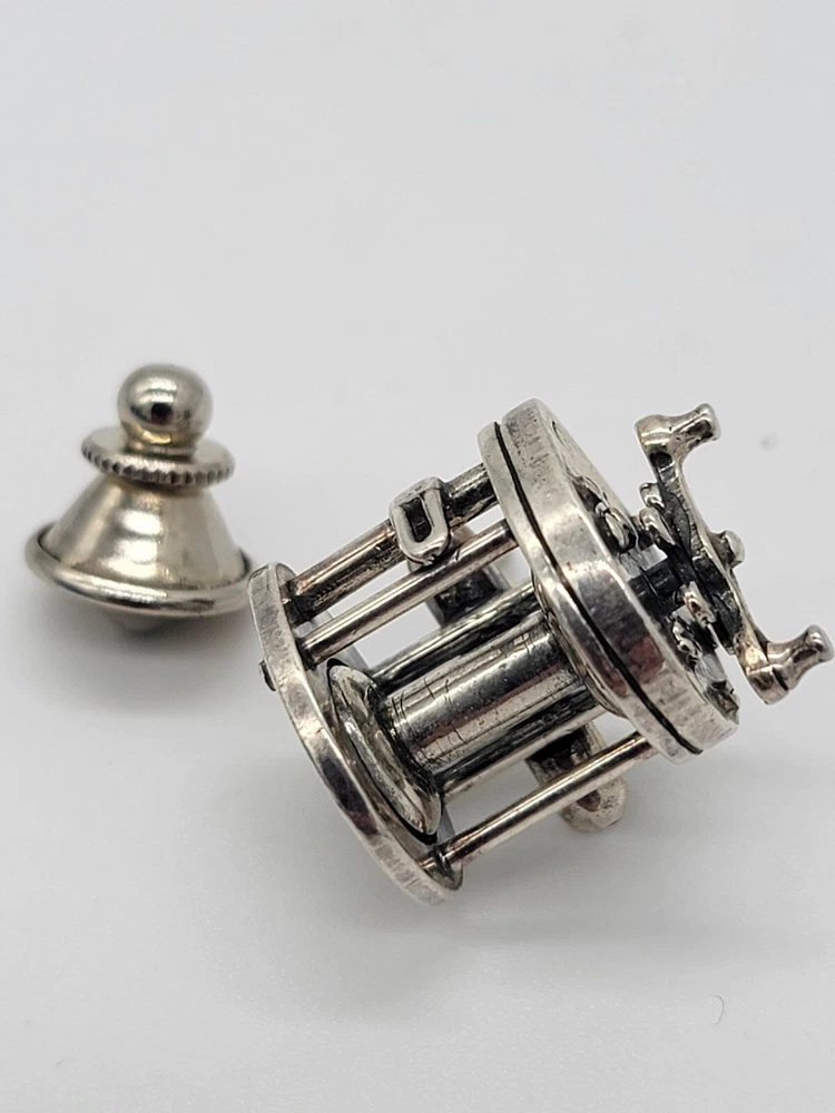 Sterling Silver Fishing Reel Lapel Tie Hat Pin - Rare Spinning Reel. PLEASE SEE ALL PHOTOS FOR DESCRIPTION AND DETAILS. PLEASE MSSG ME W/ ANY QUESTIONS, CONCERNS OR ADDITIONAL PHOTOS
