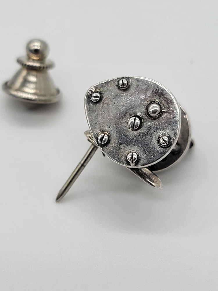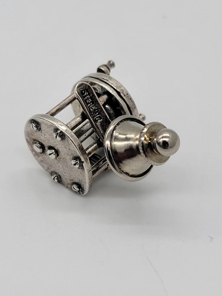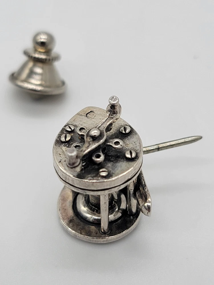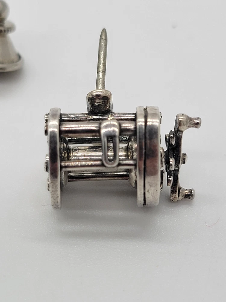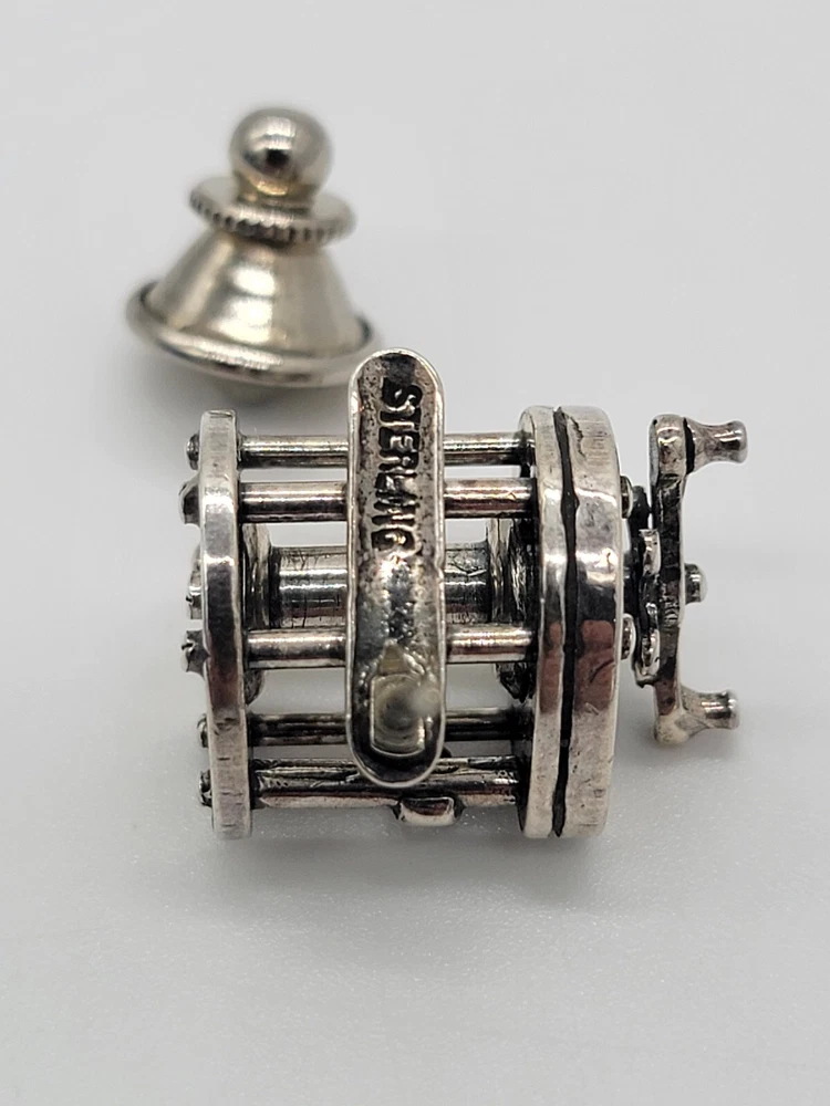 Sterling Silver Fishing Reel Lapel Tie Hat Pin - Rare Spinning Reel. PLEASE SEE ALL PHOTOS FOR DESCRIPTION AND DETAILS. PLEASE MSSG ME W/ ANY QUESTIONS, CONCERNS OR ADDITIONAL PHOTOS