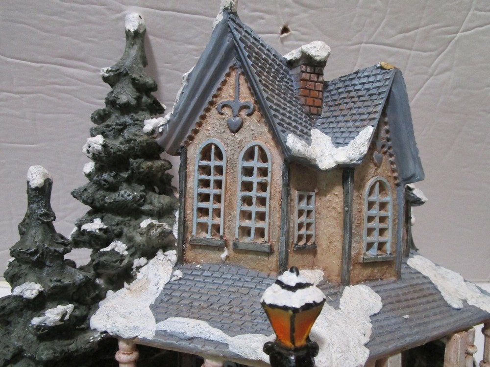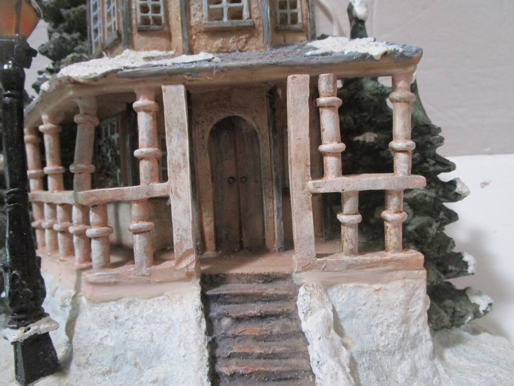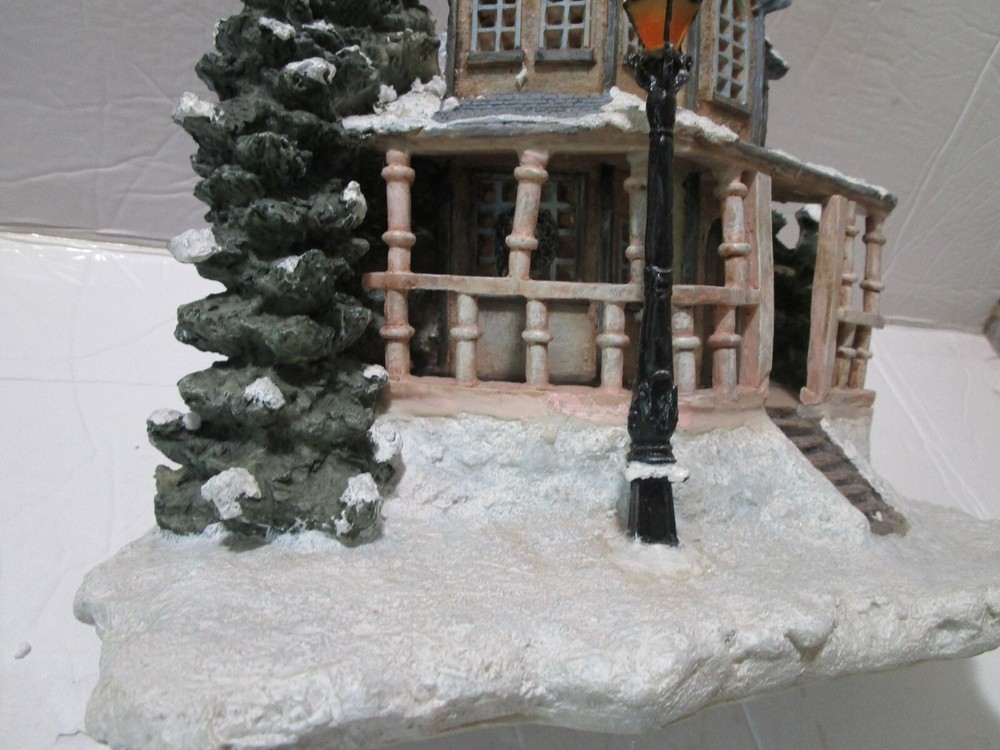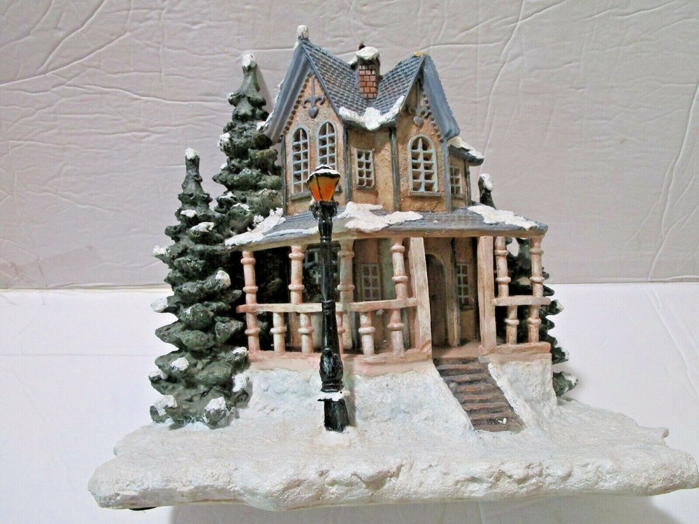 Beautiful Victorian house for a Christmas display. LIghts up. Lots of detail. Features a *flatback* (see photos) so it can be displayed on a mantle, narrow shelf or hutch. It's only 5.5" deep!! Measures: 12" high, X 10" wide, X 5.5" Deep The house sits on a snow covered base with snow dusted trees. You can also display a few figurines in front of the house as shown on the box, but not included. Very good condition, no issues. Stored carefully in it's original box. Smoke free home. Same day shipping if purchased by 3:00 PM, EST. International Sales Ship through Ebay International Shipping Program. ***We also offer FREE local Pick up for this item.*** Free No Hassle Returns. Buy with Confidence. Thank you for considering our listing, we value your business.