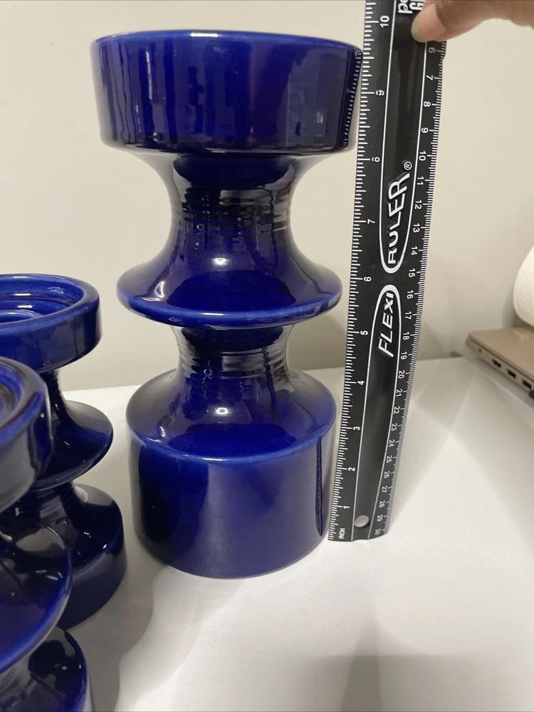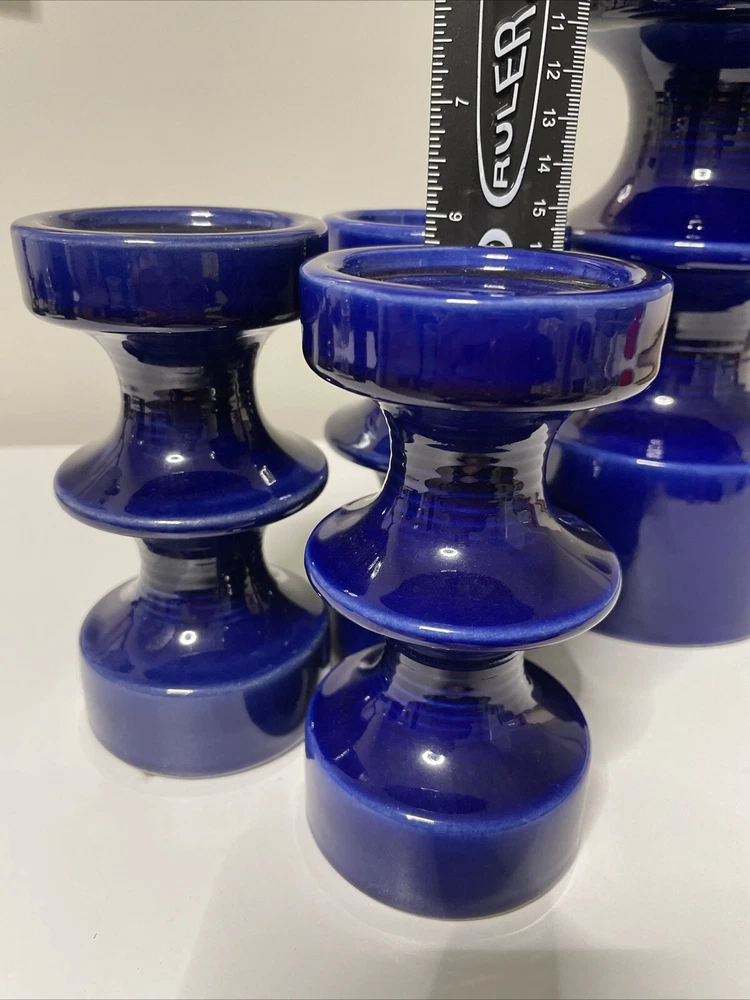 Add a touch of elegance to your home decor with this Steuler 4 Piece Blue Candleholder Set. Crafted in Germany, these candle holders are perfect for all occasions. The set includes one 9 3/4” candle holder, and 3 6” candle holders with a beautiful blue finish. Made by the renowned brand Steuler, these candle holders are a great addition to any collection. They are perfect for decorating your dining table, living room, or even your office. Get this exquisite set today and add a touch of sophistication to your home. See my other items listed for which include other Steuler pieces in blue, red, and brown. I ship using USPS ground with insurance unless otherwise stated. Thank You for shopping !!