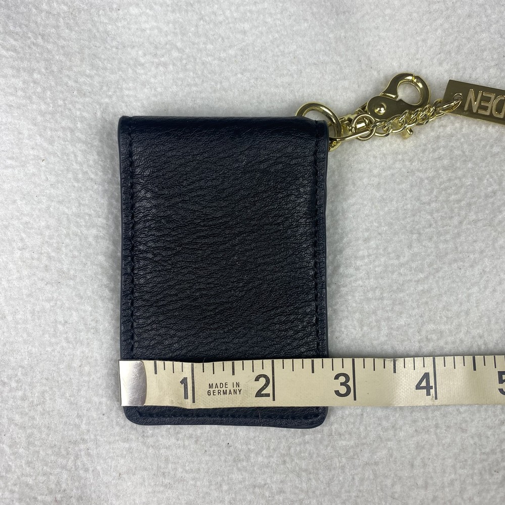 The Steve Madden Black Card Holder Charm and Keychain is a stylish accessory designed for women, featuring gold tone hardware for a touch of elegance. Perfect for keeping your cards organized and easily accessible while on the go, this keychain combines practicality with a sleek design, making it a versatile addition to any woman's accessory collection.