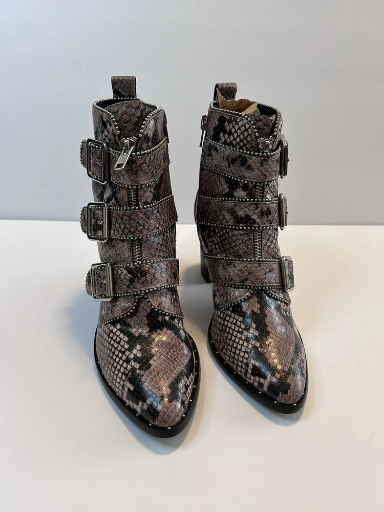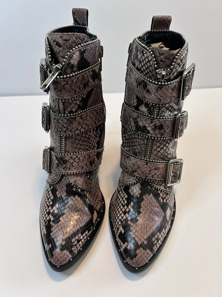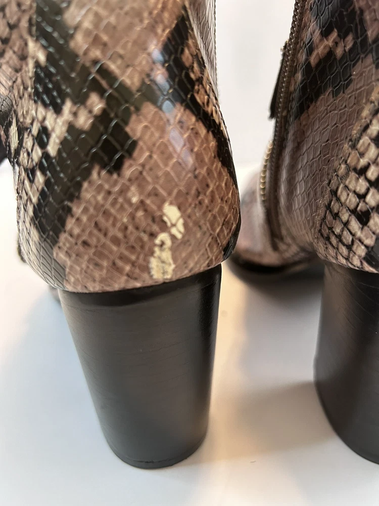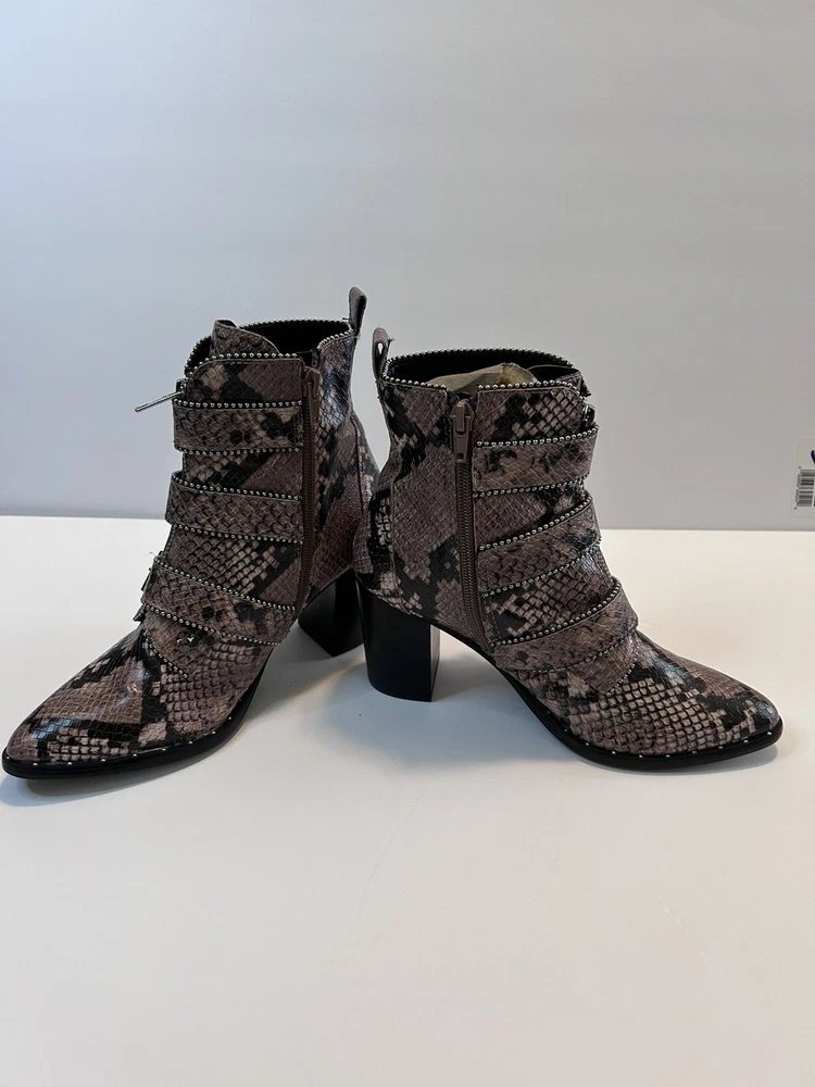 Elevate your style statement with these chic Steve Madden boots. Crafted with synthetic snakeskin upper material, these low top booties feature almond toe shape and zip closure. The multicolor animal print pattern adds a touch of wildness to your wardrobe, while the high block heel measuring 3-3.9 inches gives you the perfect lift. The studded straps and accents make these boots stand out in the crowd, making them perfect for any occasion. These women's boots are available in size 7 and are sure to be a valuable addition to your shoe collection. Size 7 Zipper closure Heel around 3” Pls check left boot has some scratches on back !!!