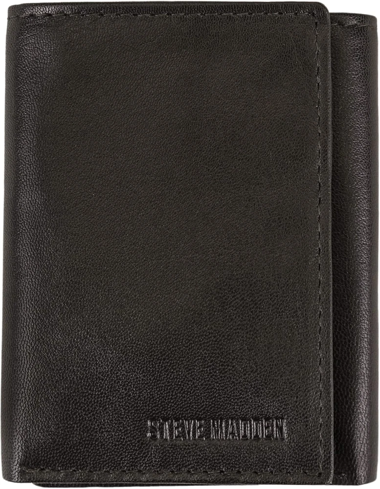 100% GENUINE LEATHER WALLET - This men's leather trifold wallet with RFID technology is crafted from genuine leather that is buttery soft to the touch, as well as extremely durable and perfect for daily use. RFID-Blocking Technology - Protect yourself from identity theft and electronic pickpocketing by upgrading your wallet to a new genuine leather RFID credit card protector. SLIM AND SMART DESIGN - This slim RFID leather trifold folds twice and is compact enough to fit easily in your pocket. Featuring 4 card slots, 3 additional pockets, and a mesh ID slot, the wearer will never be short on storage. SLEEK AND SOPHISTICATED - This slim men's trifold leather wallet is functional, sleek and sophisticated: The wallet features a mesh slot for easy access to your personal ID, and RFID blocking technology, to protect sensitive information. STEVE MADDEN QUALITY & FUNCTION - We stand by our product and believe you will too. Our STEVE MADDEN Men's fashionable leather trifold wallet with RFID technology is the best wallet for all occasions and combines durability and fashion. STEVE MADDEN GENUINE LEATHER RFID WALLET - A genuine leather slim compact trifold wallet with RFID technology, featuring 6 credit card slots, 3 additional pockets underneath the credit card slots, a clear ID slot, two cash pockets and an emBOSSed STEVE MADDEN logo.