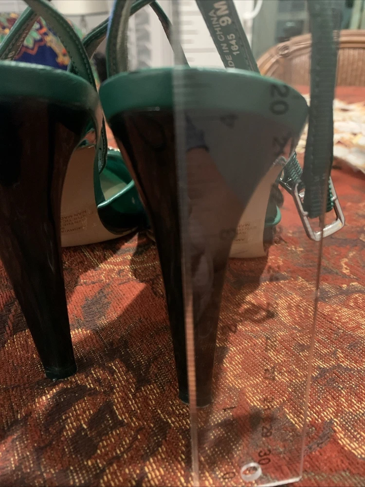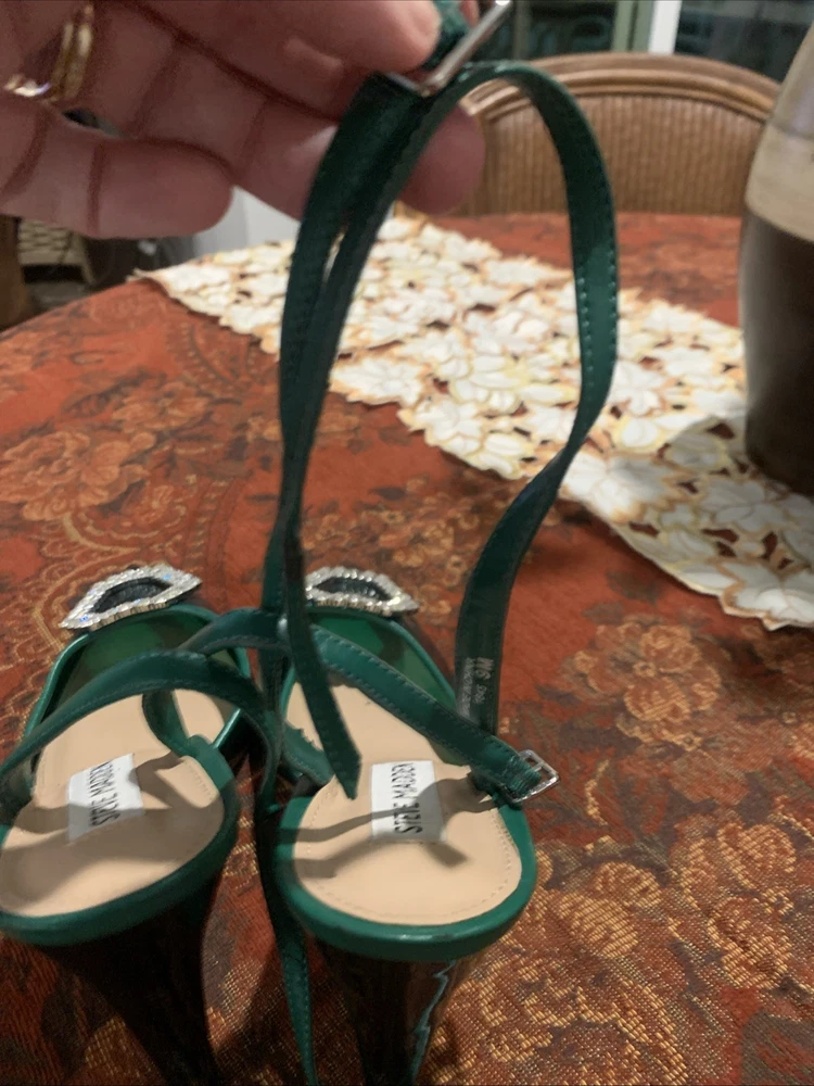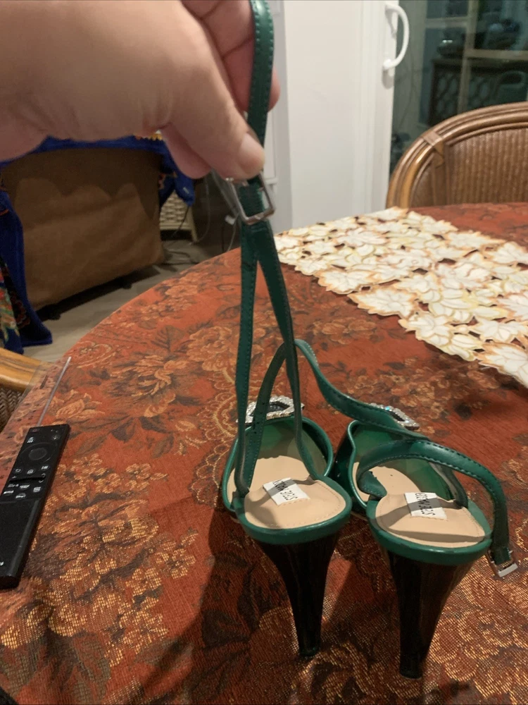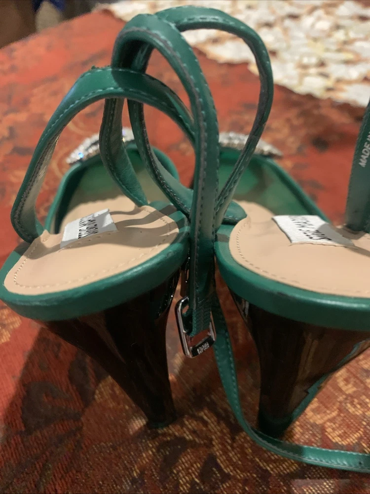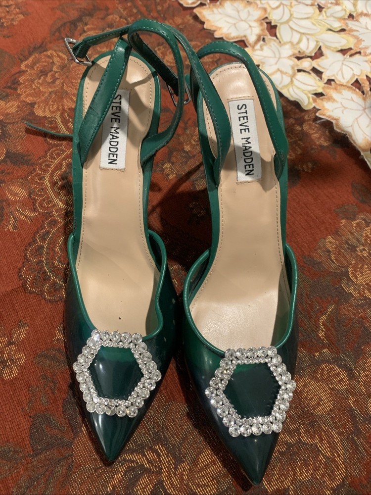 The product is a stylish Steve Madden women's high heel in a size 9, featuring a vibrant green color with a rhinestone accent on the toe. This strappy stiletto heel is perfect for a party or cocktail occasion during the summer or spring seasons. Made of synthetic material, this stylish shoe from a trusted brand like Steve Madden is sure to make a statement and add a touch of glamour to any outfit.