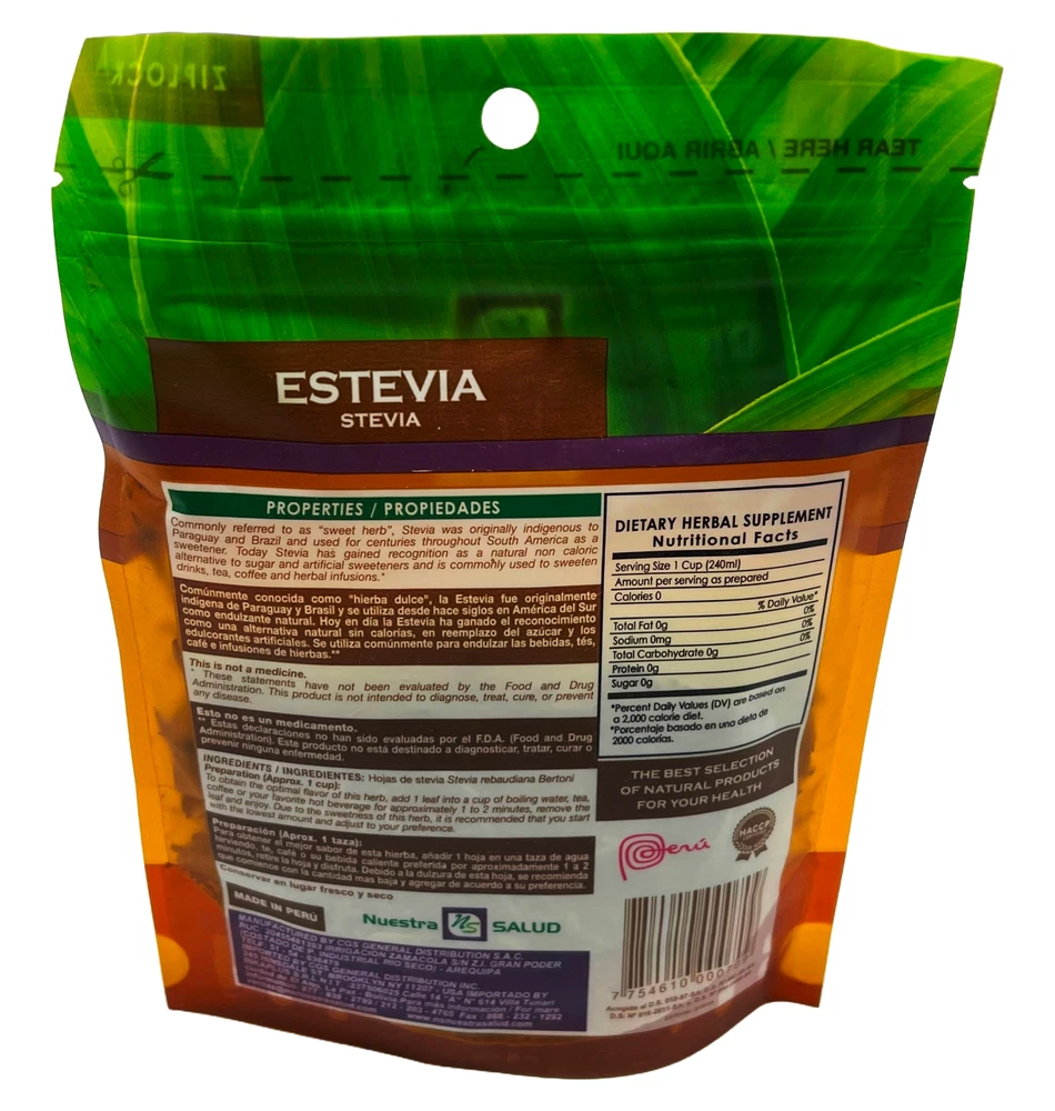 Stevia Crush Dried Leaves Etevia Herbal Tea (18g) Natural Sweetness Herb Stevia Herbal Tea from Peru Discover the natural sweetness of Stevia Herbal Tea from Peru, a delightful infusion crafted from the finest stevia leaves. Known for its incredible sweetness without the calories, stevia is a perfect alternative to sugar. Sourced directly from the lush fields of Peru, this herbal tea offers a pure and refreshing taste that can be enjoyed hot or cold. Uses: Sweetener Substitute: Use stevia herbal tea as a natural alternative to sugar in your favorite beverages and recipes. It adds a delightful sweetness without the calories, making it perfect for those looking to reduce their sugar intake. Digstive Aid: Stevia herbal tea has been traditionally used to soothe digestive discomfort. Enjoy a cup after meals to promote digestion and ease bloating. Zip-Lock Bag Superior Blends There’s an art to collecting and drying herbs; a technique passed down through Peruvian culture for centuries. We lean on this ancient knowledge to keep the potency of the herbs we collect at its peak. Our herbs are picked and packaged in their whole and unfiltered form to deliver the transformative nutrients just as Mother Nature intended: pure and simple. Next Level Freshness Taste the enchanting character of the Peruvian coast, angelic Andes, and majestic jungle. Our Peruvian herbal teas are diligently packed in zip-lock bags to tightly seal in the freshness and deliver enticing flavor with every sip. Whether you’re starting your day, re-charging your afternoon, or relaxing away in the evening, freshness will always be part of the equation. Discover the Variety Taste the enchanting character of the Peruvian coast, angelic Andes, and majestic jungle. Our Peruvian herbal teas are diligently packed in zip-lock bags to tightly seal in the freshness and deliver enticing flavor with every sip. Whether you’re starting your day, re-charging your afternoon, or relaxing away in the evening, freshness will always be part of the equation.