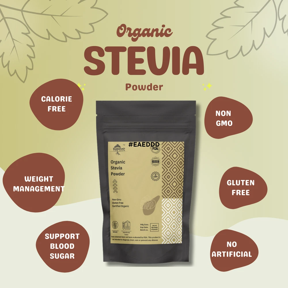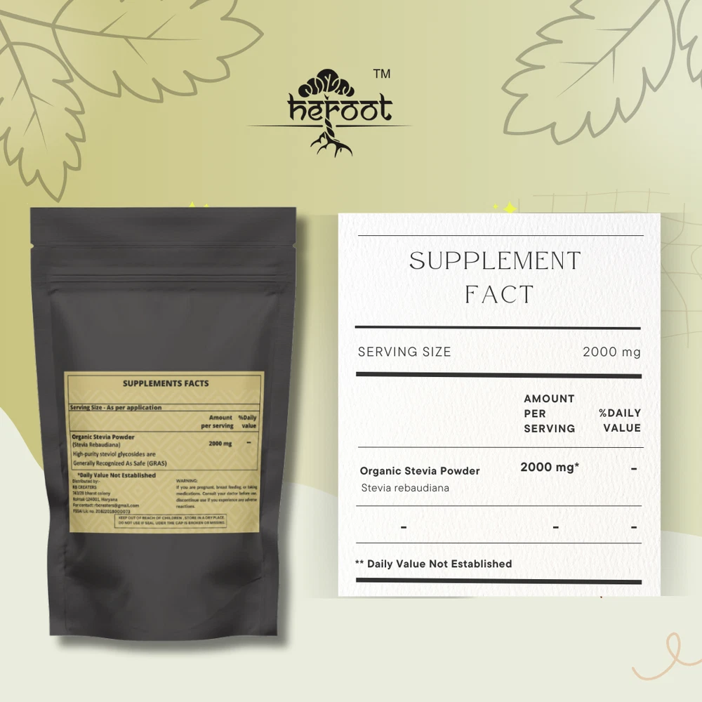Heroot Organic Stevia Powder A natural and healthful alternative to traditional sugar. Derived from the Stevia plant, this powder serves as a non-nutritive sweetener and herbal supplement, providing a delightful sweetness without the calories associated with added sugars. Stevia Leaf Powder offers a guilt-free way to enhance the flavor of your favorite meals and beverages. With its naturally sweet taste, it can be used as a substitute for sugar in various recipes, including beverages, desserts, and baked goods. Whether you're preparing a refreshing drink or indulging in a sweet treat, Stevia Leaf Powder allows you to enjoy the sweetness you crave without compromising your health. What sets Stevia Leaf Powder apart is its low calorie content. As a non-nutritive sweetener, it contains minimal calories, making it an excellent choice for individuals who are conscious of their caloric intake. By incorporating Stevia Leaf Powder into your daily routine, you can reduce your consumption of added sugars while still satisfying your sweet tooth. Aside from its sweetening properties, Stevia Leaf Powder is also recognized as an herbal supplement. It has been used for centuries in traditional medicine for its potential health benefits. While more research is needed to fully understand its effects, some studies suggest that Stevia may have antioxidant and anti-inflammatory properties, making it a potentially valuable addition to your wellness routine. Key Ingredients: Stevia leaf powder Key Benefits Weight control Blood pressure Diabetes pancreatic cancer Allergies Childrens diets Directions For Use: Consume 2gm with lukewarm water after a meal Or as directed by your healthcare provider How To Consume: Can be mixed with warm milk & honey Can be taken with juices & smoothies Can be taken directly with honey Can be filled in capsule and consumed with water Safety Information: Store in a cool dry place Keep out of reach of children If you are pregnant or lactating or prone to any food allergy or under any medical condition consult your healthcare practitioner before use Disclaimer The above description is for information and knowledge purpose, not a healthcare professional advice. Please consult your doctor and/or pharmacist before you take this vitamin. Pregnant or lactating women, diabetics, hypoglycemics, and people with known medical conditions and/or taking drugs, should consult with a licensed physician and/or pharmacist prior to starting any supplementation program. The above statements have not been evaluated by the Food & Drug Administration. Shipping and Handling Shipping time will be 1 business day after the cleared payment We will ship by Indian Post service Shipment will take 15-30 days. Few more days for your local customs delay and formalities. For Express service additional charges will be applied. For any reason you wish to leave Negative or neutral feedback, Please contact us first and let us mutually resolve it. We care for your satisfaction and will make sure that you are happy with the transaction to post us 5**** ratings in all areas. ***Customs Information*** Heroot will not be liable for packages refused or held by customs for delivery. We request that you contact customs office and ask about import regulations and restrictions before placing your order. It is importsnt for you to become familiar with customs policies for your specific country before ordering. Customs regulations differ by country and not knowing their regulations can result in your order incurring high import duties, the delivery being delayed or even returned. Please check with your customs office to see if your country permits the shipment of the products you are planning to order from us and if any additional licenses or permits are needed. Please note: if your order is returned to us due to banned/ restricted products policy, a wrong address, refusal to pay customs fees, refusal to accept the order or because no one was there to accept the delivery of your order, we will refund your order as follow: you will be refunded the total amount of the order, minus the original shipping charge.