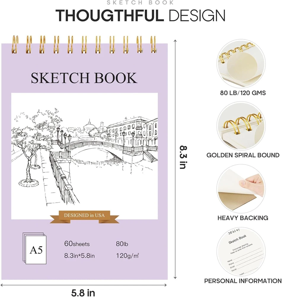 Stilip 5.5" x 8.5"Sketch Book,1-Pack A2-Light Purple Product Details Brand: stilip Color: A2-Light Purple Material: Paper Sheet Size: 5.5*8.5 Inches Paper Finish: Smooth 【Convenient Spiral Binding】- Featuring a sturdy spiral binding at the top,this art sketch pad provides easy access for flipping through pages.Detaching paper is hassle-free, ensuring that the paper remains in pristine condition at all times,thereby enhancing your drawing and writing experience.The side spiral design of the 5.5"*8.5" spiral sketchbook allows for smoother expression without disturbing your wrist during sketching.Its convenient design offers ease of use for artists. 【Compact Size with Protective Cover】- Each pack contains 60 sheets of 5.5"*8.5" paper,making our art notebook portable and easy to carry in various backpacks.These artist sketchpads are always ready to capture inspiration wherever it strikes.The portable 5.5*8.5 sketchbook eliminates the need for a drawing board,allowing you to carry it with you effortlessly.These sketchbooks for adults contribute to making your drawing life more enjoyable and fulfilling,making them an ideal choice for creative endeavors. 【Acid-Free & Fade-Resistant】- We use only recyclable,acid-free,and pH-neutral drawing paper to minimize smudges,blotches,or transfers,ensuring the longevity and vibrancy of your artwork.These drawing pads for artists ensure that your artwork remains vibrant and lasts for years under normal use and storage conditions.Share your creations with friends and family with confidence. 【Suitable for All Skill Levels】- Our drawing notebook is suitable for beginners and professionals alike,offering a platform to learn and develop drawing skills.These art sketchbooks make a perfect gift for drawing enthusiasts of all skill levels.With the rough texture of the sketch paper providing excellent drawing effects, the sketchbook is an excellent gift choice.Enhance your sketching skills with these drawing pads for adults and enjoy the creative process.