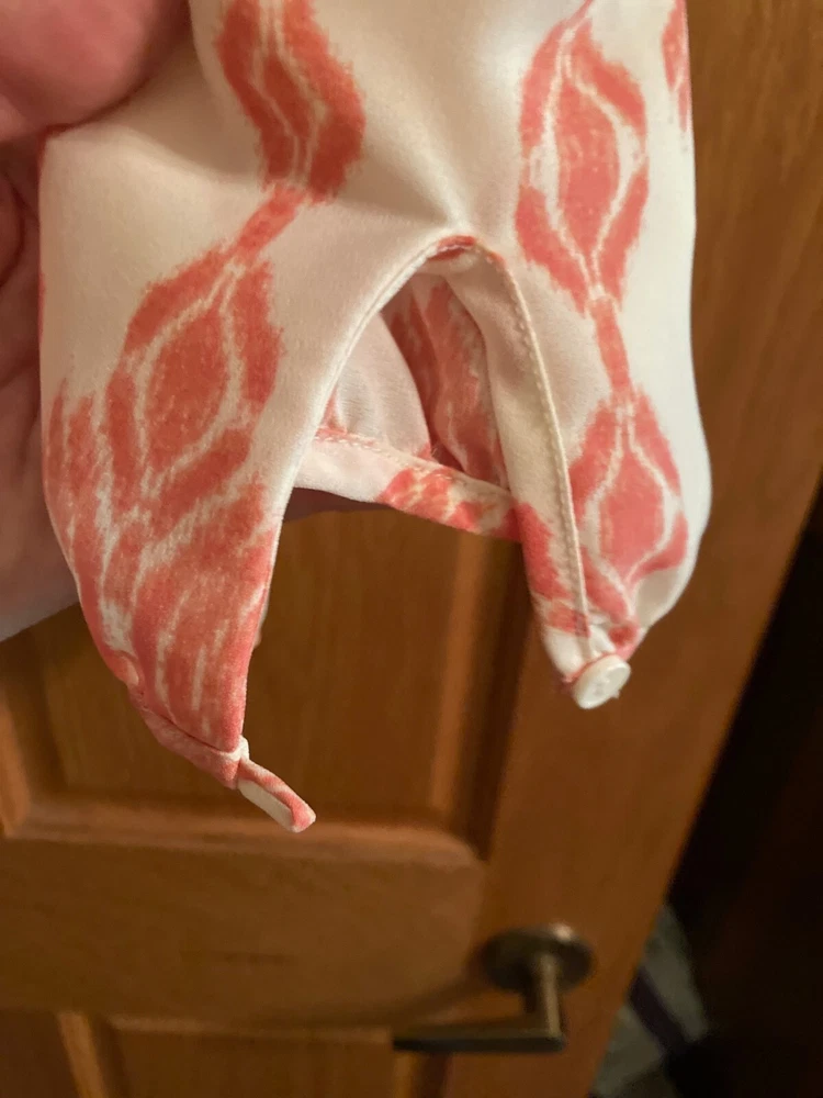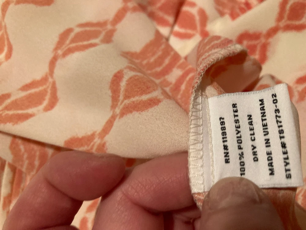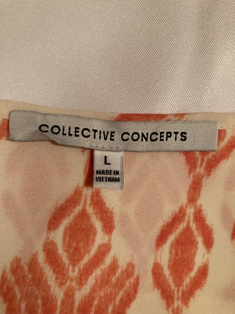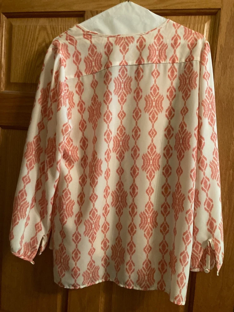 Stitch Fix Collective Concepts Fischer Button Down Blouse Women Large, 100% Polyester. White and Salmon Print. Neckline pleats add fit and flow. Summer into Fall wear. Button sleeves. Worn 1x. Dry Clean Only. Originally 68.00.
